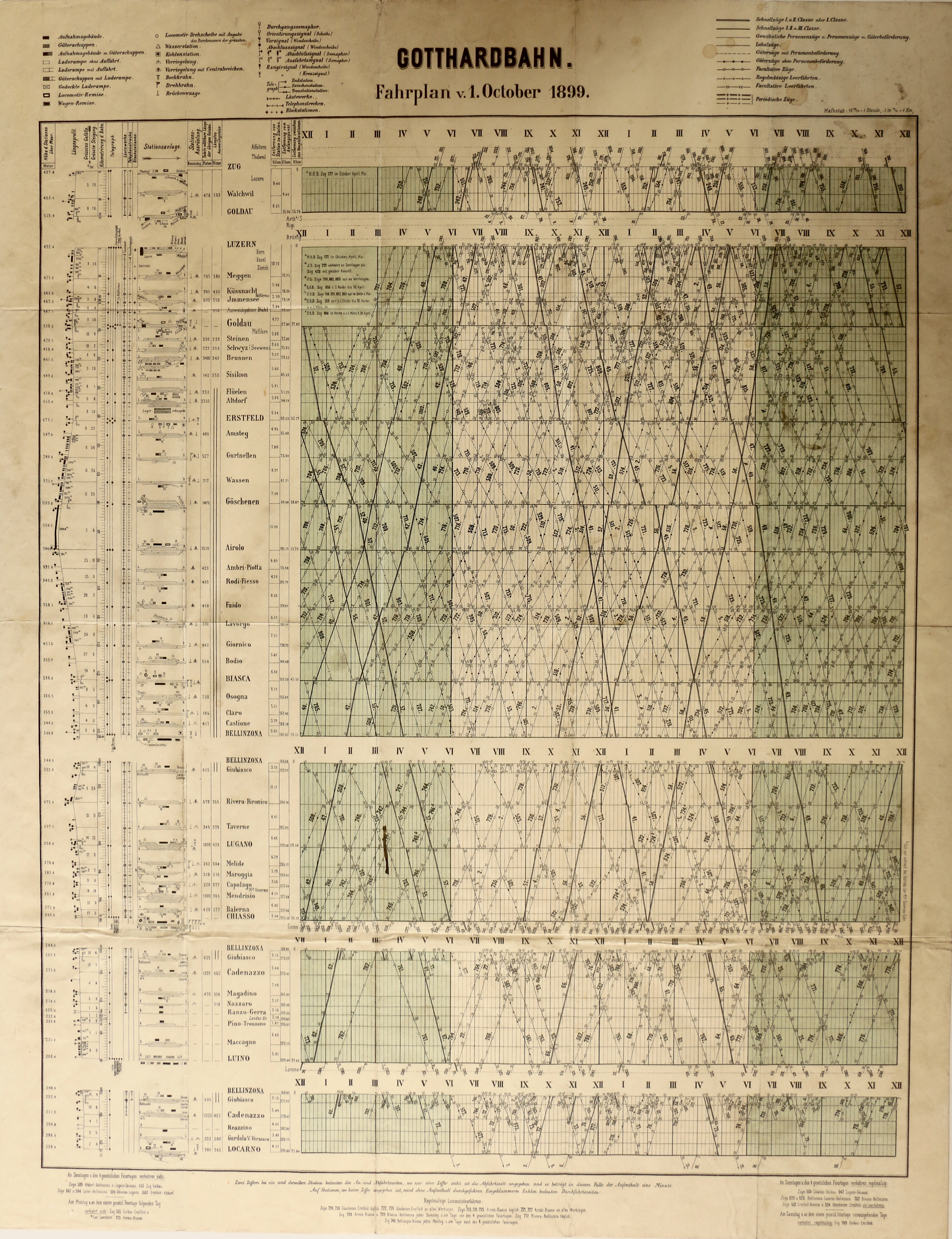 1899년 고트하르트 철도 그래픽 시간표는 고트하르트 터널 개통 및 철도 완공 17년 후의 운영과 관련된 정보를 담고 있다. 각 역의 해발 고도, 종단 프로파일, 신호등, 터널 및 길이, 경사, 거리, 전신 및 네트워킹, 신호 벨 및 연결, 전화, 폐색 신호소, 선로 배치 및 장비, 측선, 역 이름 및 거리, 출발 및 도착 시간 등이 표시되어 있다.