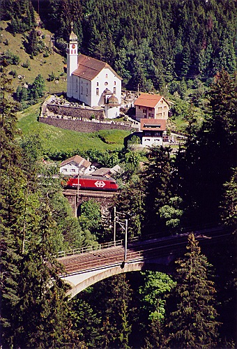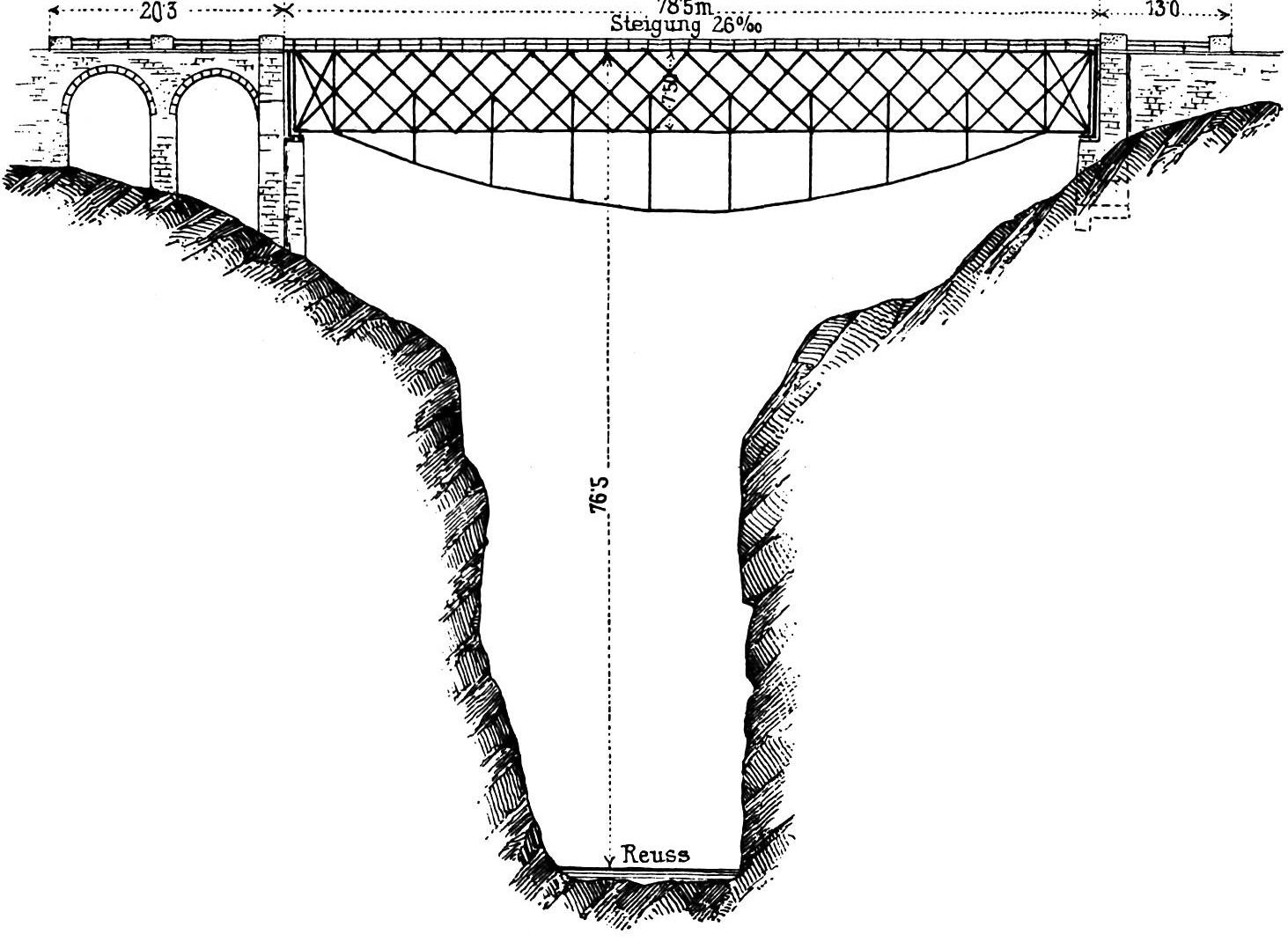 '''Intschireuss 다리'''는 낮은 수위에서 76m 위에 레일이 있으며, 최대 75m 경간을 가지고 있다. 다리는 철 구조물이 교체되기 전에 "물고기 배"로 보강되었다.