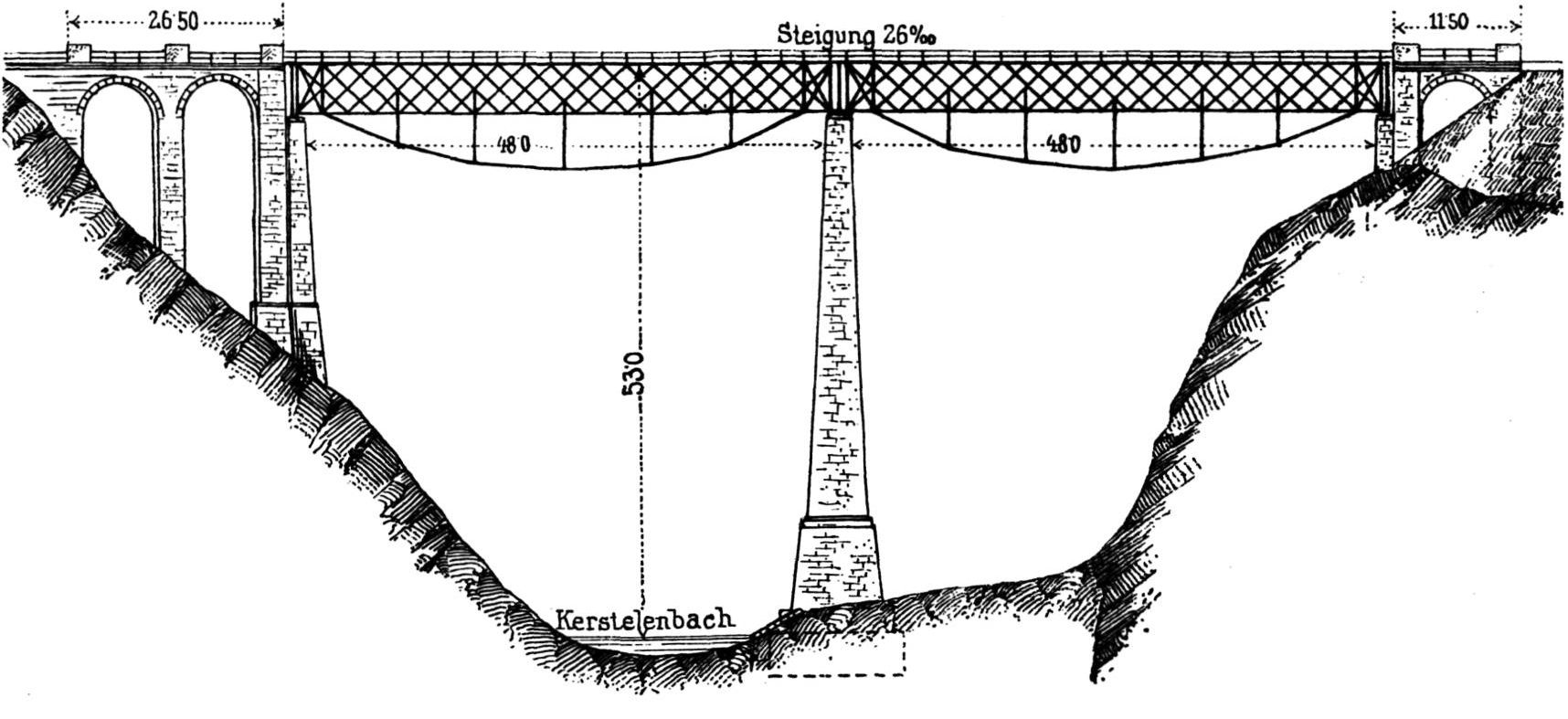 '''Chärstelenbach 다리'''는 각각 50m 경간을 가진 두 개의 통로가 있으며, 낮은 수위에서 53m 위에 레일이 있다. 다리는 물고기 배 구조로 보강되었다. 현대식 교체는 여전히 원래의 중앙 기둥과 석조 아치 받침대를 사용한다.