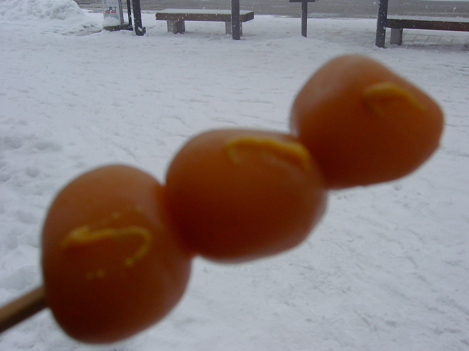 구슬 모양의 곤약을 3개 또는 4개 정도씩 나무젓가락에 꽂아 큰 냄비에 간장 베이스의 국물로 삶은 것이다. 옥 곤약을 삶을 때는 육수를 사용하고 청주를 넣는다. 먹을 때는 겨자를 찍어 먹는다. 야마가타현과 군마현의 일부 지역에서는 관광지, 축제, 학원제 등에서 반드시 판매된다고 해도 과언이 아니다. 또한, 도쿄 등지에 있는 야마가타의 향토 요리를 판매하는 이자카야의 메뉴에 올라와 있는 경우도 있다.