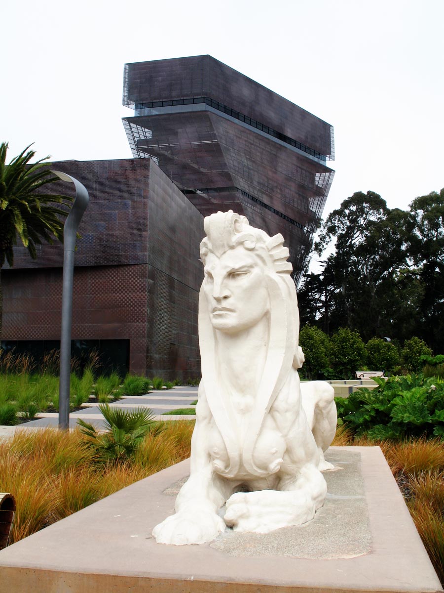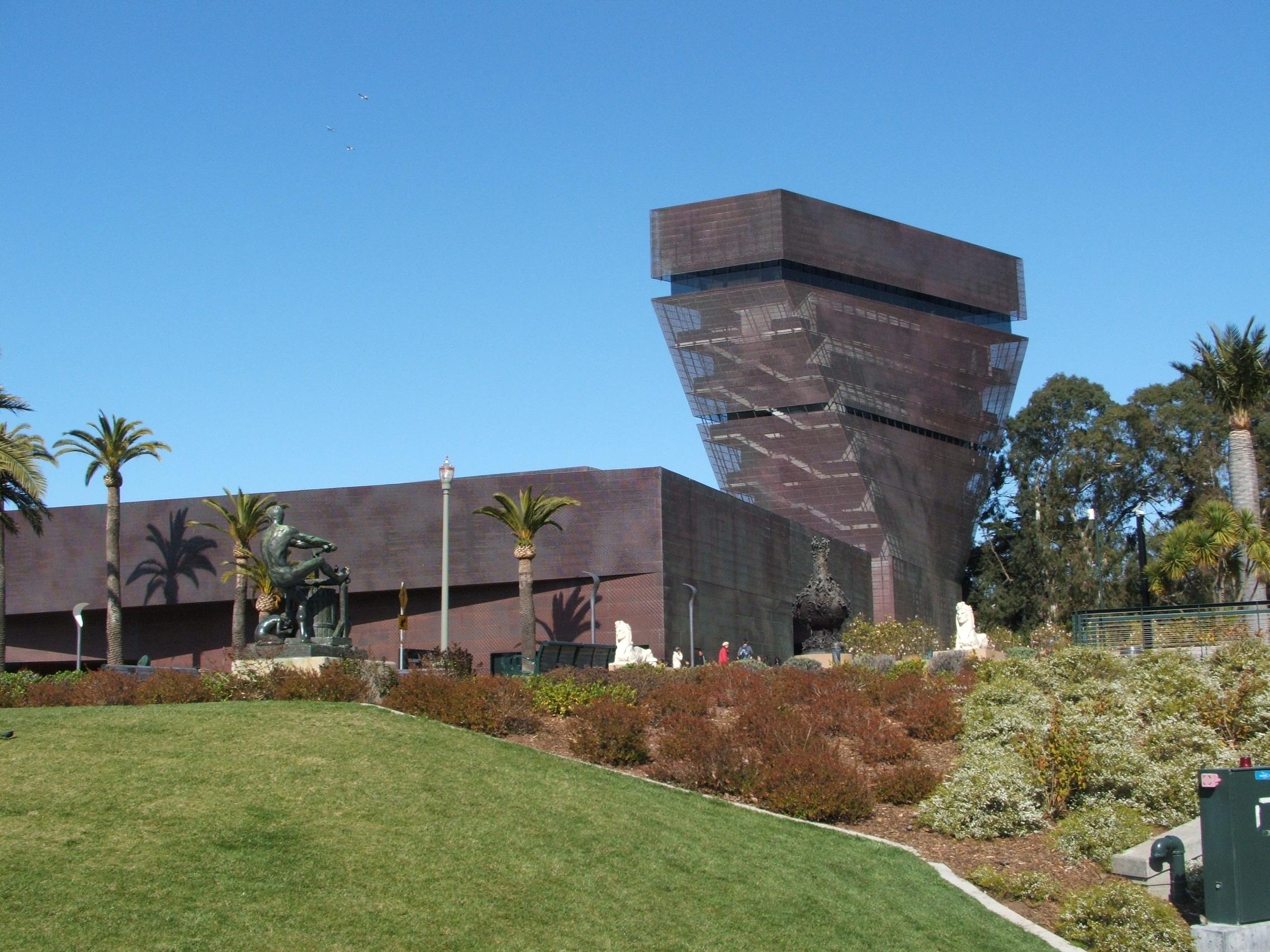 원래의 드영 기념 박물관은 2001년까지 존속하다가 2005년에 재건축되어 재개관했다. 헤르초크 & 드 뫼롱은 "예술 작품이 계층적으로 덜 제시되는" 공간을 만들고 싶었다고 말했다.[30] 건물은 주로 구리로 지어졌으며, "햇빛과 샌프란시스코의 안개에 의해 돋보일 것"이라는 아이디어를 바탕으로 디자인되었다.[30] 샌프란시스코 아시아 미술관은 이전했지만, 드영 미술관은 여전히 미국 미술, 현대 미술, 아프리카 미술, 직물 및 조각품, 특별 교체 전시를 특징으로 한다.
