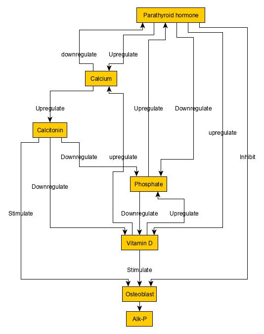 - 비타민 D(칼시트리올): 휴면 파골세포를 자극하여 뼈 흡수를 촉진한다.[4]