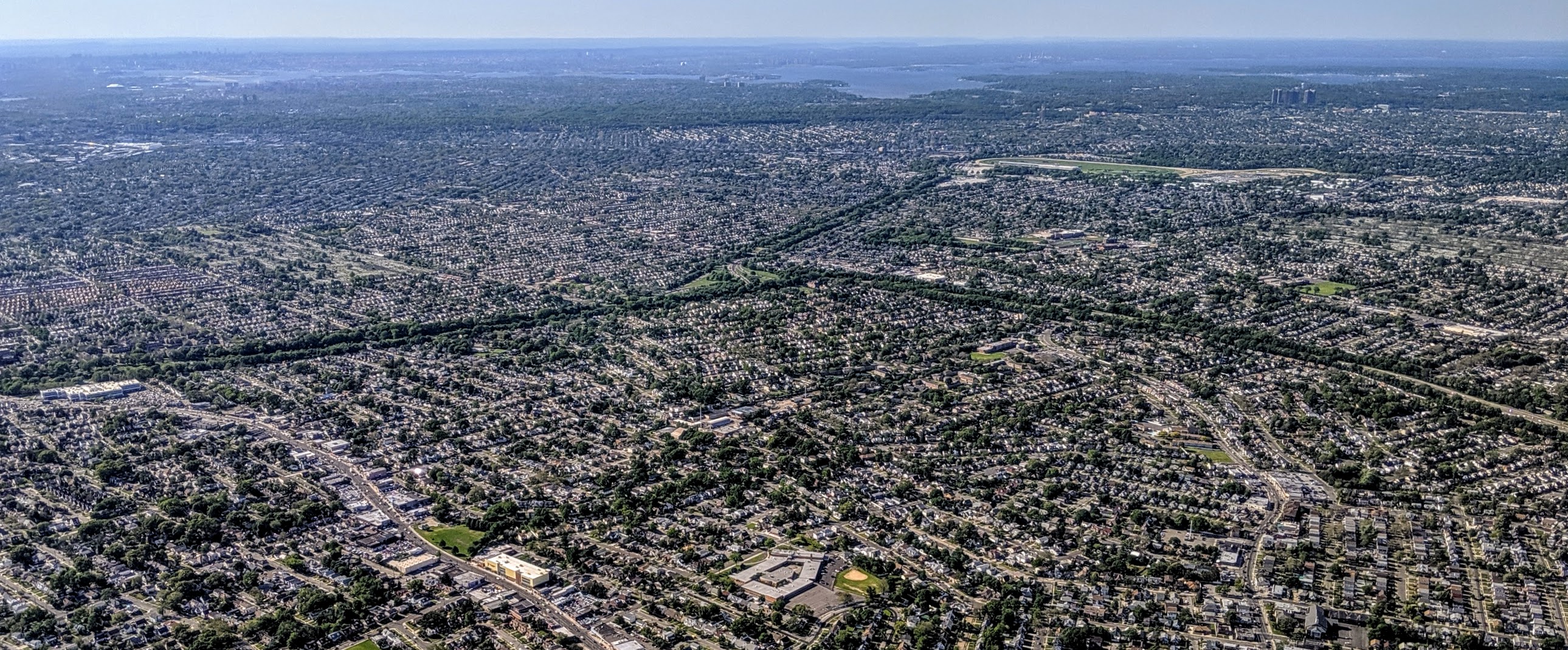 밸리스트림 (전경)과 나소군, 벨트 파크웨이, 서던 스테이트 파크웨이, 크로스 아일랜드 파크웨이의 항공 사진