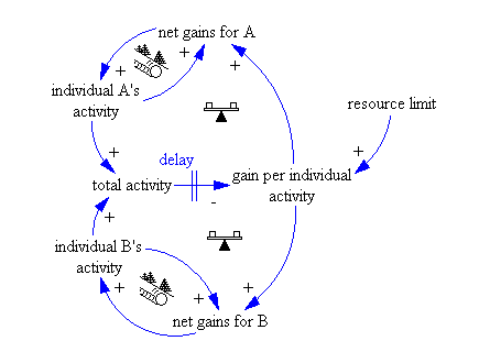 로이드는 한 목축업자가 할당된 수보다 더 많은 소를 공동 목초지에 방목하면 과방목이 발생할 수 있다고 가정했다. 추가적인 동물 한 마리당 목축업자는 추가적인 이익을 얻을 수 있지만, 전체 그룹은 공유지에 발생하는 피해를 공유하게 된다.[6] 모든 목축업자가 이러한 개별적으로 합리적인 경제적 결정을 내린다면, 공유지는 고갈되거나 심지어 파괴될 수 있으며, 이는 모든 사람에게 해가 된다.