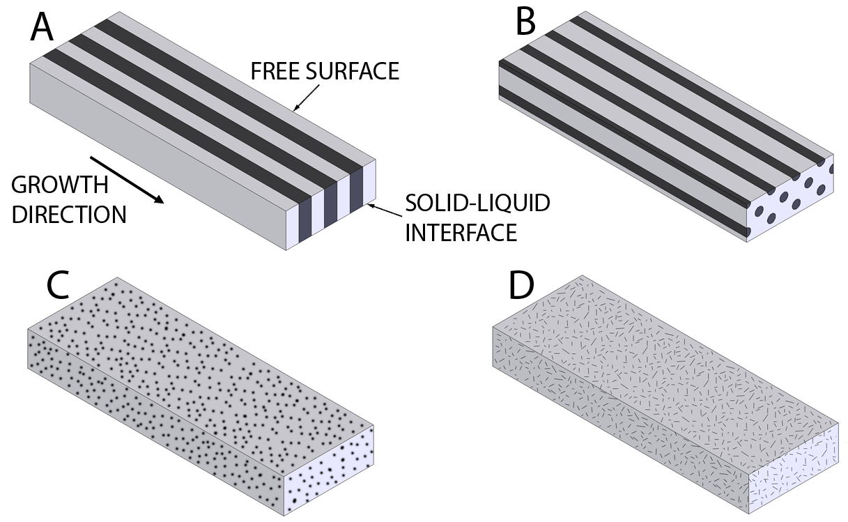 공융 반응으로 생성된 고체 거시구조는 몇 가지 요인에 따라 달라지며, 가장 중요한 요인은 두 고용체의 핵 생성 및 성장 방식이다. 가장 일반적인 구조는 라멜라 구조이지만, 막대형, 구형 및 침상 결정 구조도 가능하다.[6]3. 비공융 조성