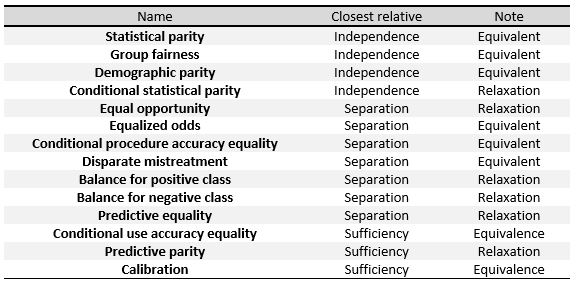주어진 분류기가 공정한지, 즉 예측이 민감한 변수의 영향을 받지 않는지 판단하기 위해 세 가지 주요 평가 기준이 정의된다.[67]