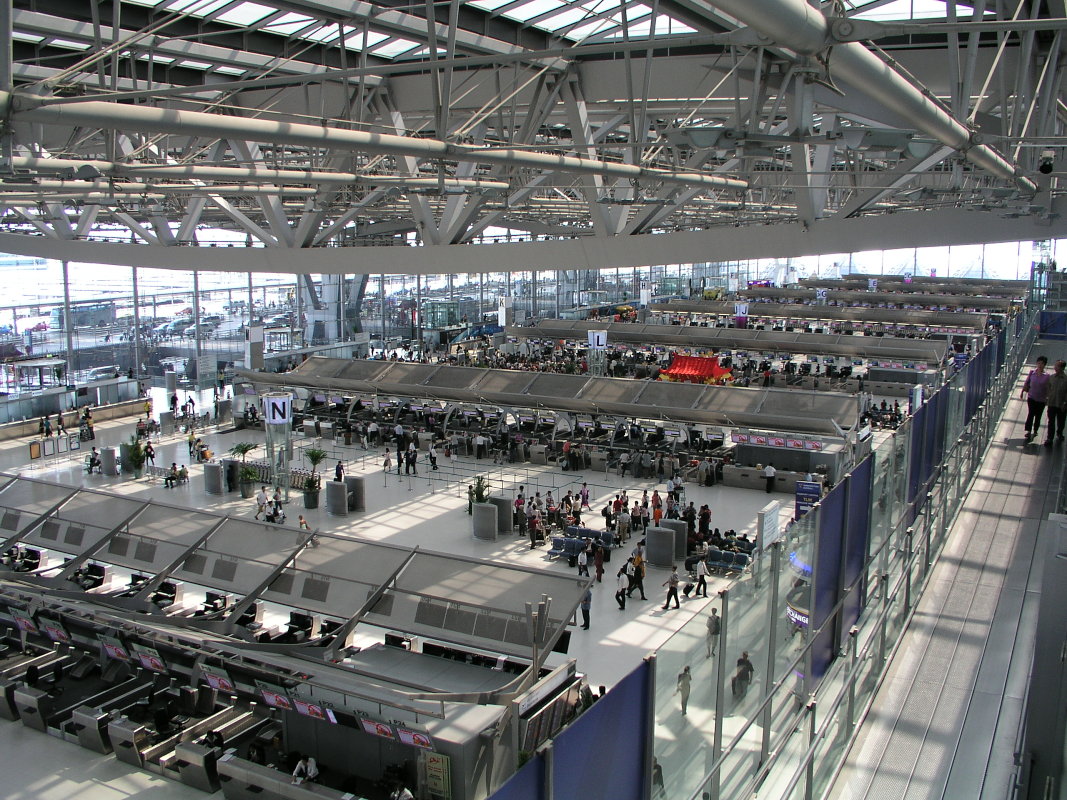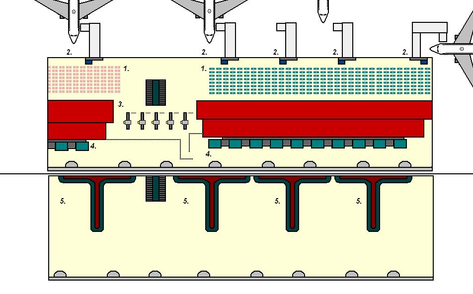 - 다층 (수직 분리): 매우 높은 승객 통행량에 사용된다. 이 방식에서는 출발 승객과 도착 승객이 전혀 섞이지 않는다. 분리가 수평일 수도 있지만, 일반적인 배치는 출발 순환을 상층에 배치하고 도착 승객 흐름은 하층에서 발생하도록 한다(경로 끝에서 출발 승객은 비행기로 안내된다).