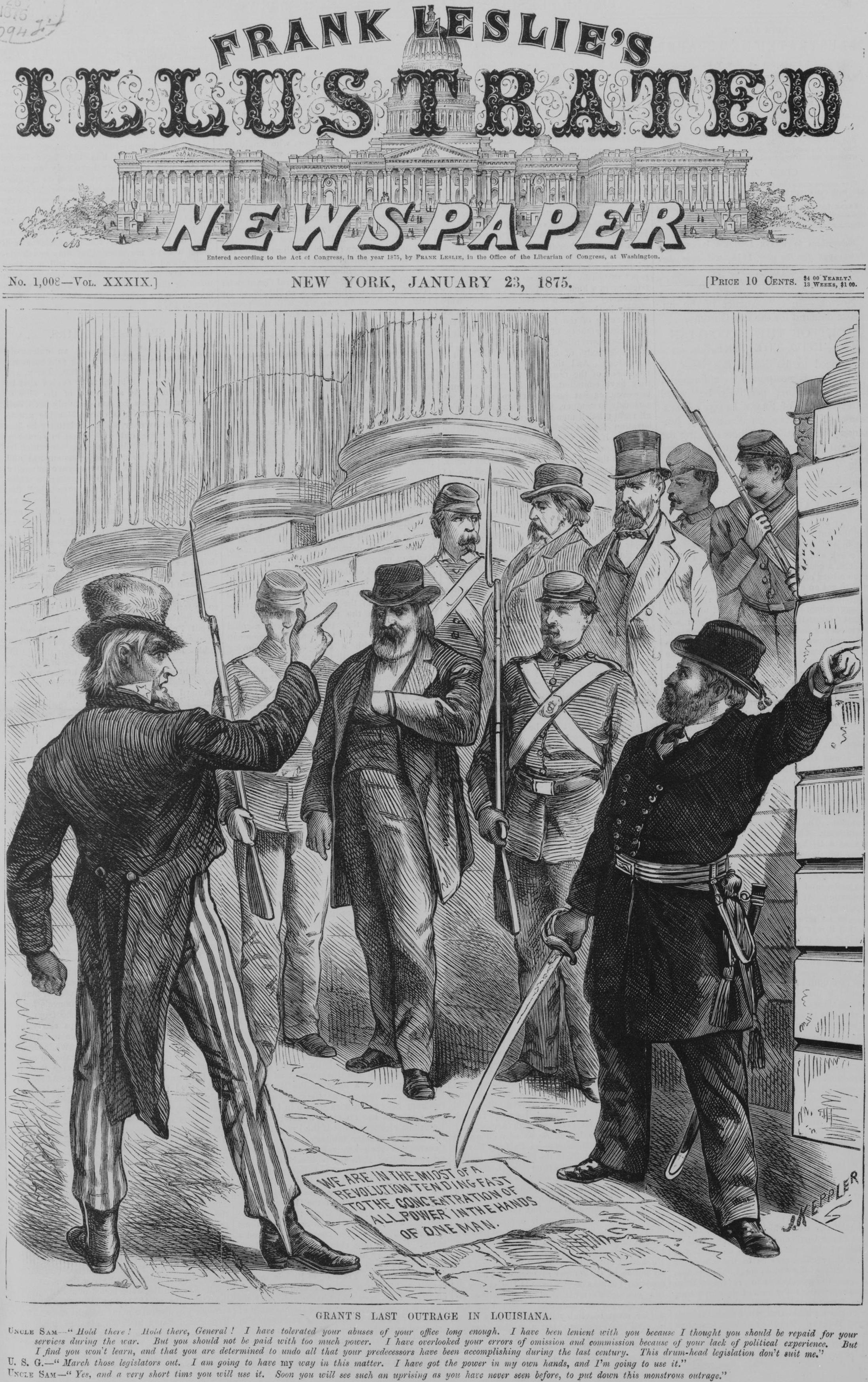 공화당은 1872년 미국 대통령 선거에서 그랜트의 재선을 놓고 분열되었고, 자유 공화당은 서머를 포함하여 새로운 제3당을 결성하여 그랜트에 반대했다. 자유주의자들은 큰 패배를 겪었지만, 1873년에 경제가 불황에 빠졌고, 1874년에는 민주당이 권력을 되찾아 급진파의 지배를 종식시켰다.[18]