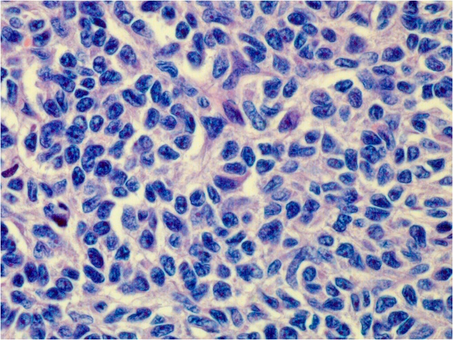 유리질 구체가 있는 청소년 과립막 세포 종양. H&E 염색.