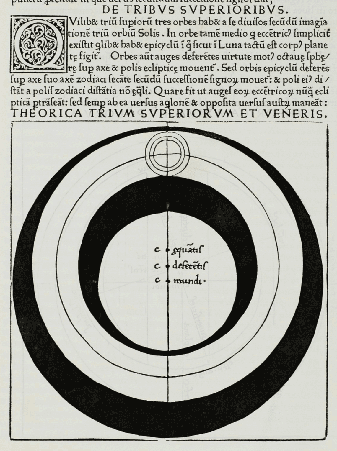 - 천상계는 영원불변하는 제5원소인 에테르로 이루어져 있으며, 천체들은 완벽하고 균일한 원운동을 한다고 믿었다.[29] 중세 천문학은 아리스토텔레스의 이러한 틀 안에서 관측되는 천체의 불규칙한 운동을 설명하기 위해 여러 개의 균일한 원운동을 조합하는 방식으로 이론을 발전시켰다.[30]