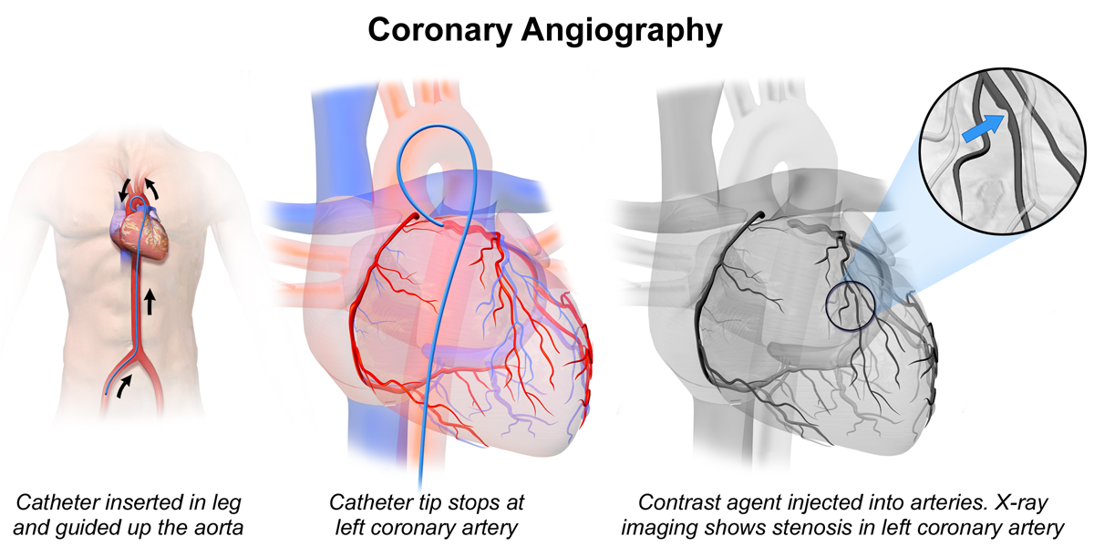 관상동맥 질환을 확인하고 평가하는 여러 방법이 있다. 병력 및 임상 검사 외에 비침습적 방법으로는 휴식 또는 운동 중의 심전도(ECG) 및 흉부 엑스레이가 있다. 심장 초음파 검사는 좌심실 비대, 박출 계수, 심장 판막 상태를 측정하여 심장 기능을 정량화할 수 있다. 관상동맥 질환을 감지하는 가장 정확한 방법은 관상동맥 조영술 및 관상동맥 CT 혈관 조영술이다.[3] 혈관 조영술은 관상 순환 및 병변의 상세한 해부학적 구조를 제공한다. 각 병변의 중요성은 직경 손실에 의해 결정된다. 직경 손실 50%는 횡단면적 손실 75%로 나타나며, 대부분 중간 정도로 간주된다. 중증 협착은 직경 손실 2/3 이상, 즉 횡단면적 손실 90% 이상을 나타낸다.[4] 협착의 중증도를 더 정확하게 결정하기 위해 중재적 심장 전문의는 혈관 내 초음파를 사용하여 중증도를 결정하고 죽상 경화반의 구성에 대한 정보를 제공하기도 한다. 분획 혈류 예비력 기술을 사용하면 협착 후의 압력이 평균 대동맥 압력과 비교된다. 비율이 0.80 미만이면 협착이 유의한 것으로 간주된다.[4]