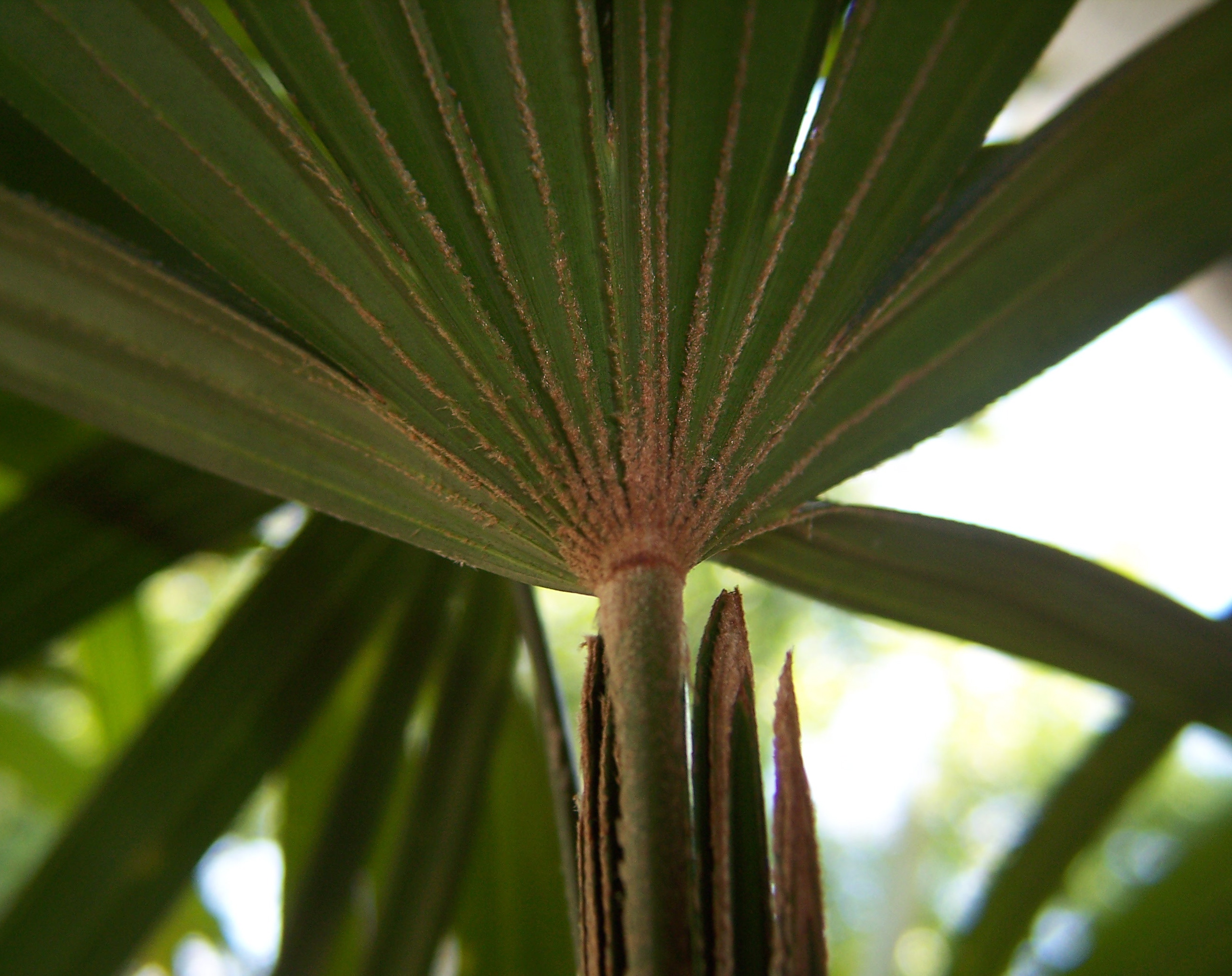 상록 관목으로, 짧은 지하경을 뻗어 번식한다.[7] 여러 포기가 모여 자라며, 줄기는 곧게 서서 높이 1m~3m, 굵기는 2cm 정도에 이른다.[7] 줄기는 분기하지 않고, 그 표면은 오래된 엽초와 그 섬유로 단단하게 싸여 있다.[7] 섬유는 흑갈색이지만, 실제 수피는 녹색이다.[7] 잎은 줄기 끝에 모여 나며, 긴 잎자루 끝의 잎몸은 길이 15~25cm 정도로, 손바닥 모양으로 4~8개로 갈라진다.[9] 잎몸에는 세로 주름이 있으며, 표면을 향해 부풀어 있으며, 끝은 가늘게 갈라진다. 잎의 질감은 딱딱하고 녹색이 짙다.[7]