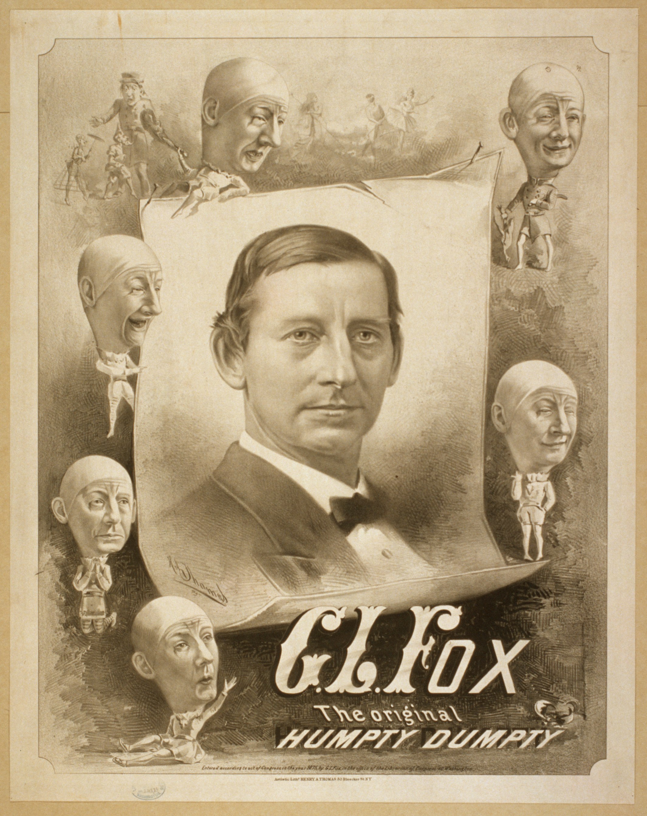 미국의 첫 번째 위대한 화이트페이스 광대는 무대 스타 조지 "G.L." 폭스였다. 그리말디에게 영감을 받은 폭스는 1860년대에 미국 전역에서 험프티 덤프티 이야기를 대중화했다.