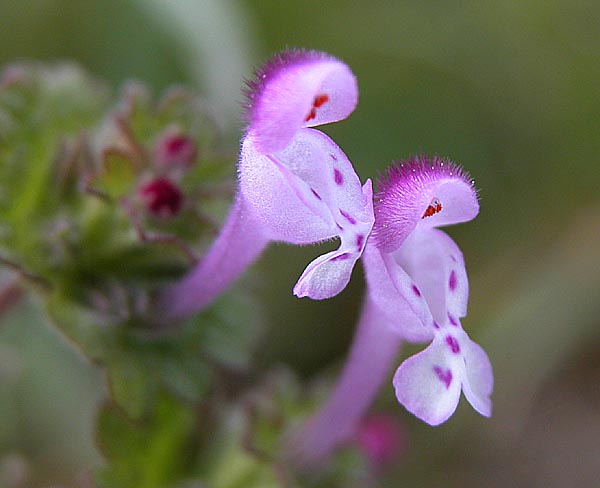개화기는 3월에서 6월 사이이며[13], 북부 지역에서는 봄에 매우 일찍 피고 따뜻한 지역에서는 겨울과 초봄에도 핀다. 꽃은 위쪽 잎겨드랑이에서 여러 송이가 모여 돌려나듯 달리며, 길이는 1.5cm에서 2cm 정도이다.[2][3][13] 꽃잎은 붉은빛이 도는 자주색 입술 모양이며 길이는 15mm에서 20mm 정도이다.[2][3] 윗입술꽃잎은 투구처럼 앞으로 약간 구부러져 있으며 짧은 털이 빽빽하게 나 있고 길이는 3mm에서 5mm 정도이다. 아랫입술꽃잎은 3개로 갈라지는데, 가운데 조각이 가장 크고(1.5mm에서 2.5mm 길이) 짙은 붉은색 반점이 있다.[2][3][13] 꽃받침은 5갈래로 나뉘며 꽃이 진 후에 닫힌다.[2][3] 보통의 꽃 외에도 꽃봉오리 상태로 수분하여 열매를 맺는 폐쇄화가 함께 달리는 경우가 많다.[13] 드물게 흰 꽃이 피는 품종(''f. albiflorum'')도 있다.[13] 수술은 4개인데 그중 2개가 더 긴 두긴수술이다.[2][3] 암술은 2개의 심피가 합쳐져 있다.[2][3] 꽃가루받이를 해줄 곤충이 적은 이른 봄에는 꽃이 스스로 자가수분하기도 한다. 열매는 4개로 나뉘는 분열과이다.[2][3]