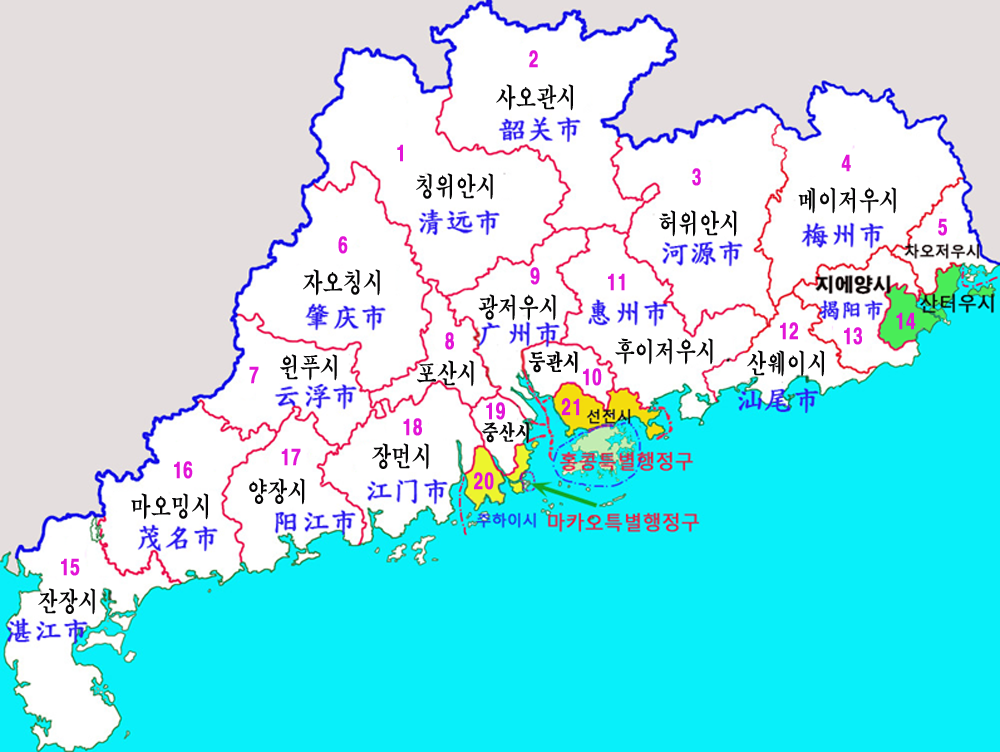 (광주시)广州市 Guǎngzhōu Shì 7,434.40 15,923,860 웨슈구 21 선전시