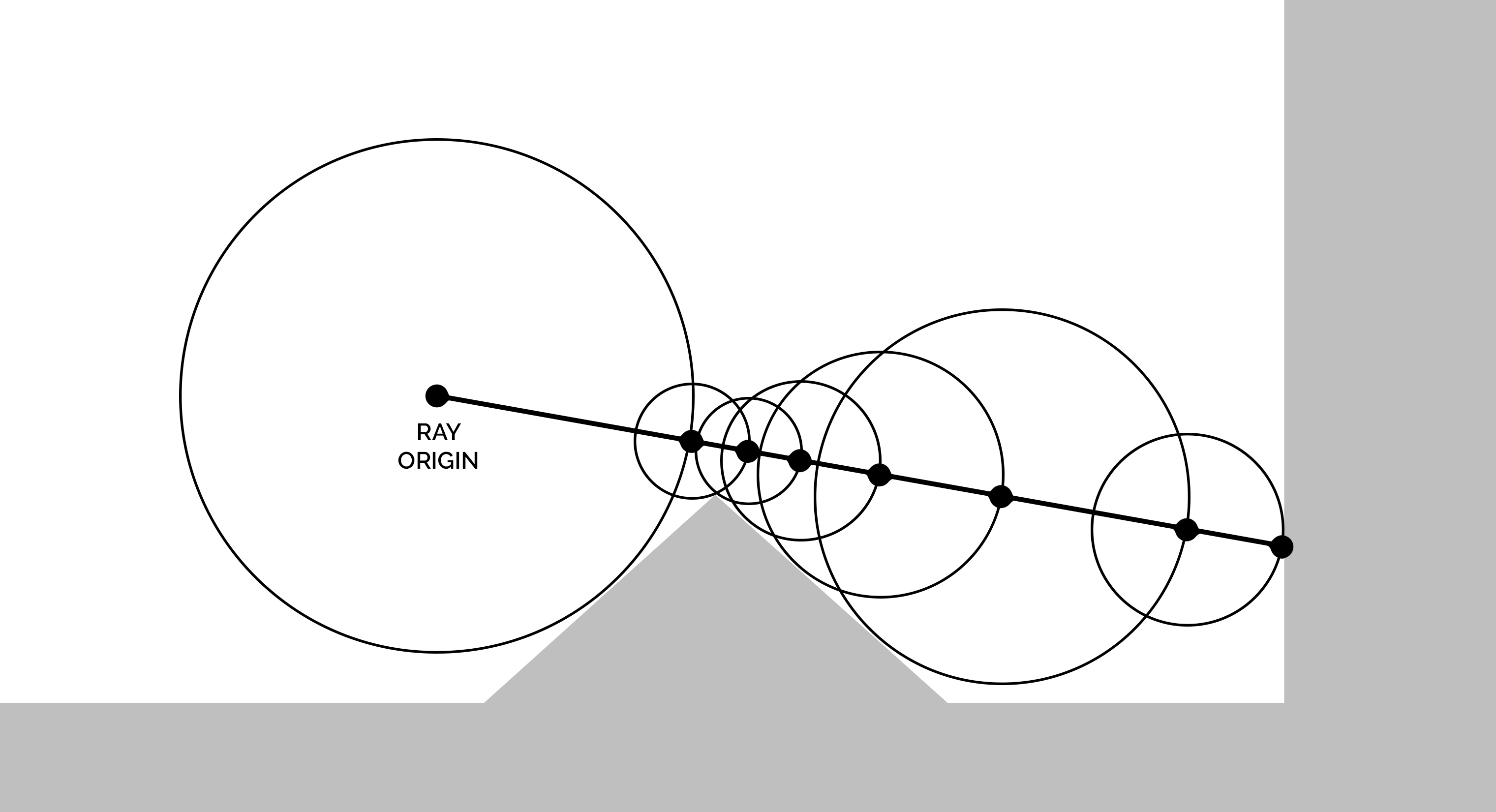 SDF 광선 행진(구 추적[16])은 각 광선을 여러 단계로 추적하여 광선과 부호화된 거리 함수(SDF)로 정의된 표면 사이의 교차점을 근사한다. 각 반복에 대해 SDF가 평가되어 표면의 어떤 부분도 놓치지 않고 가능한 한 큰 단계를 수행한다. 표면에 충분히 가까운 점에 도달하면 반복을 멈춘다. 이 방법은 3D 프랙탈 렌더링에 종종 사용된다.[17]