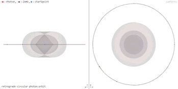 여기서 는 블랙홀의 단위질량당 각운동량이다.[23] 다른 일정한 반경을 가지는 궤도도 존재하지만 적도 근처의 위도에서 위아래로 진동하는 더 복잡한 경로를 가지고 있다.[23]