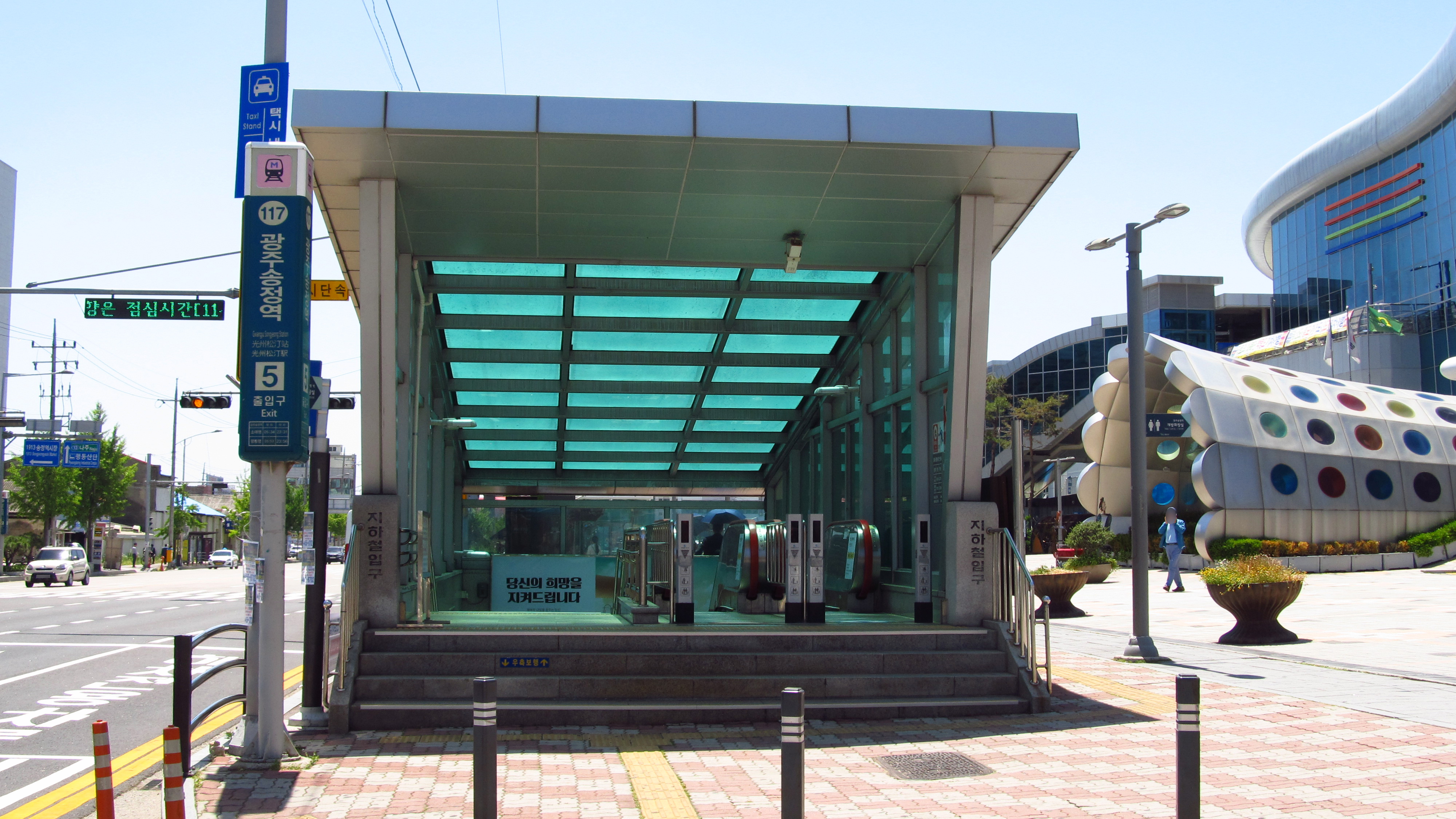 출구 번호 사진 목적지 1 광산구청, 보건소, 송정2동 행정복지센터, 광산구청 제2청사, 송정우체국, 송정중학교, 명동아파트, 대천아파트, 어룡신협, 광주은행 송정지점 2 상아아파트, 송광중학교, 송정농협 역전지점 3 송정라인2차아파트, 광주광역시 농업기술센터, 광주송정역 4 광주송정역 5 영광통사거리