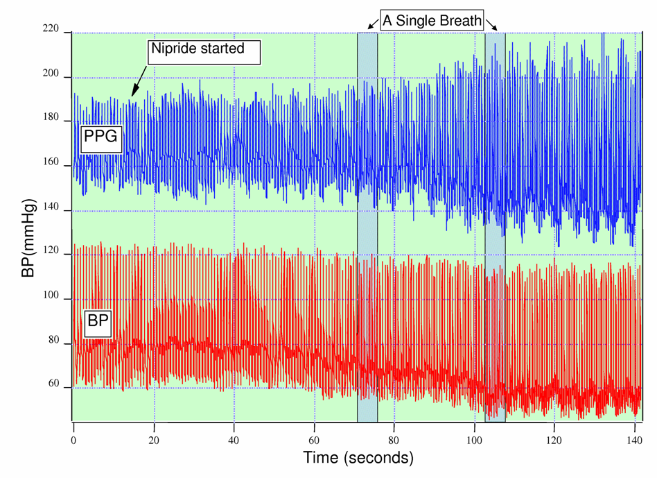 샤미르(Shamir), 에이델만(Eidelman) 등은 수술 전 혈액 은행을 위해 환자의 혈액량 10%를 제거하는 것과 흡입 사이의 상호작용을 연구했다.[17] 이들은 맥박 산소 측정기의 광혈류 측정법과 동맥 카테터 모두에서 혈액 손실을 감지할 수 있음을 발견했다. 환자들은 심장이 압박될 때 숨을 내쉴 때 심장 전 부하 감소로 인해 심장 맥박 진폭이 감소하는 것을 보였다.