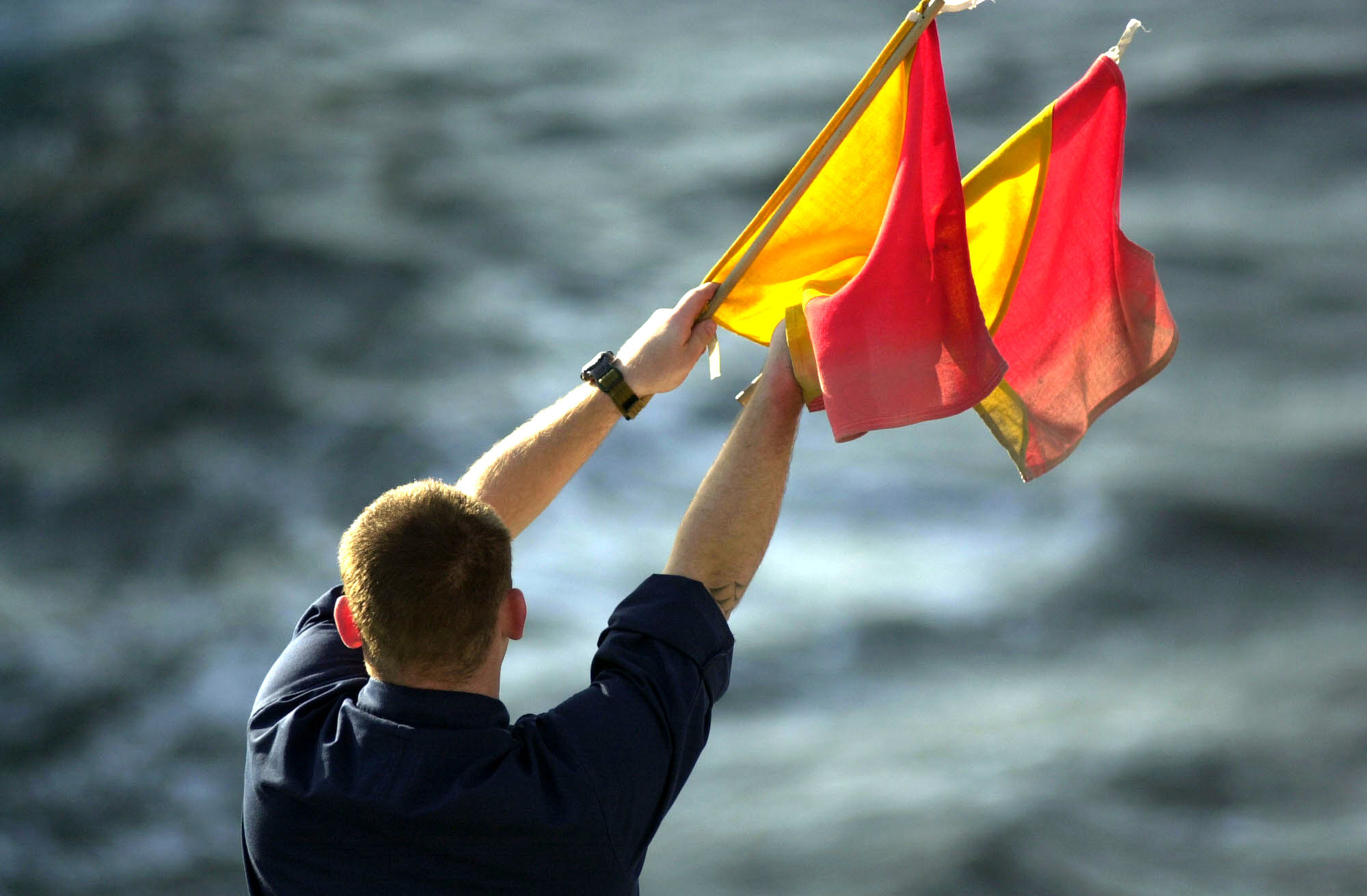 수기신호기를 이용해 메시지를 전달하는 해군 신호병 (2002년).