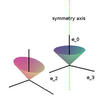 z영어 좌표는 불필요하므로, 3차원 다양체에 집중하여 r영어 = 0 대칭축에서 벗어날 때 빛원뿔이 어떻게 변하는지 살펴보면 다음과 같다.