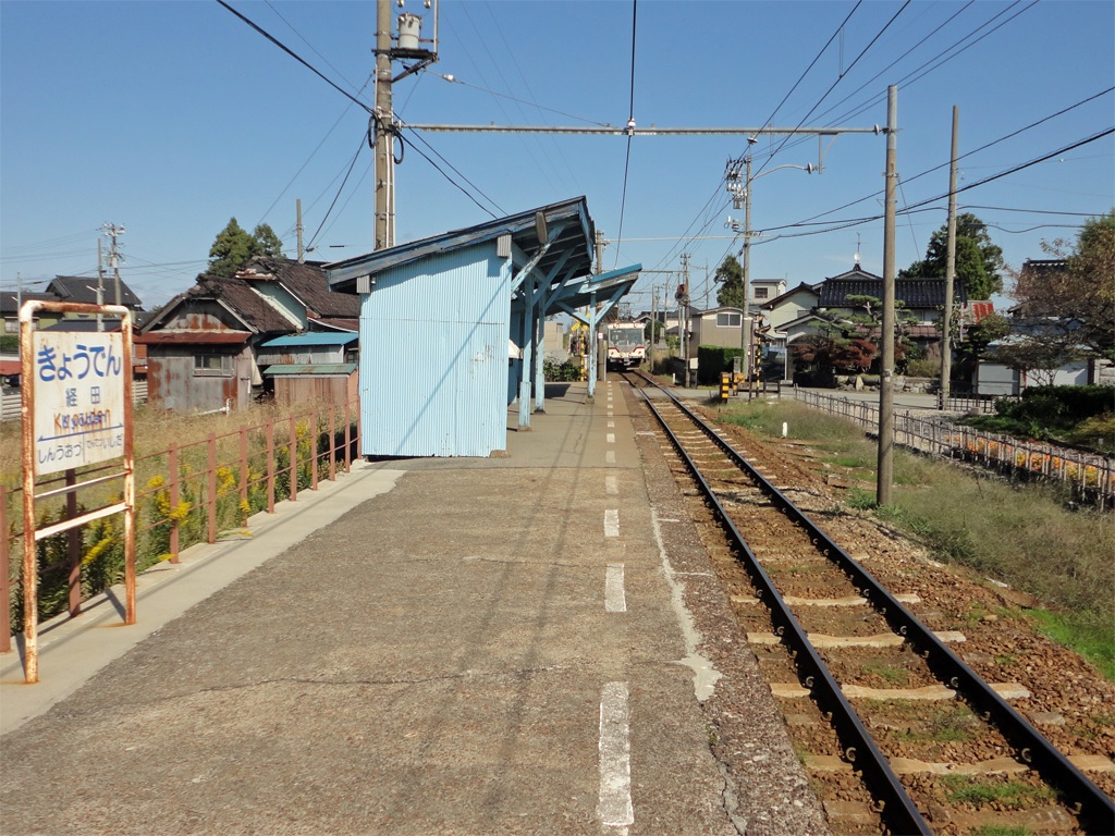 교덴역은 단선 승강장 1면 1선 구조의 지상역으로, 역무원이 배치되어 있다. 인접한 신우오즈역과 덴테츠 이시다역은 열차 교환이 가능한 역으로 개업했지만, 교덴역은 단선 승강장으로 운영된다. 다만, ভবিষ্যতে 2면 2선 열차 교환이 가능하도록 산 쪽에 부지가 확보되어 있다.[2] 목조 역舎가 설치되어 있다.3. 역사