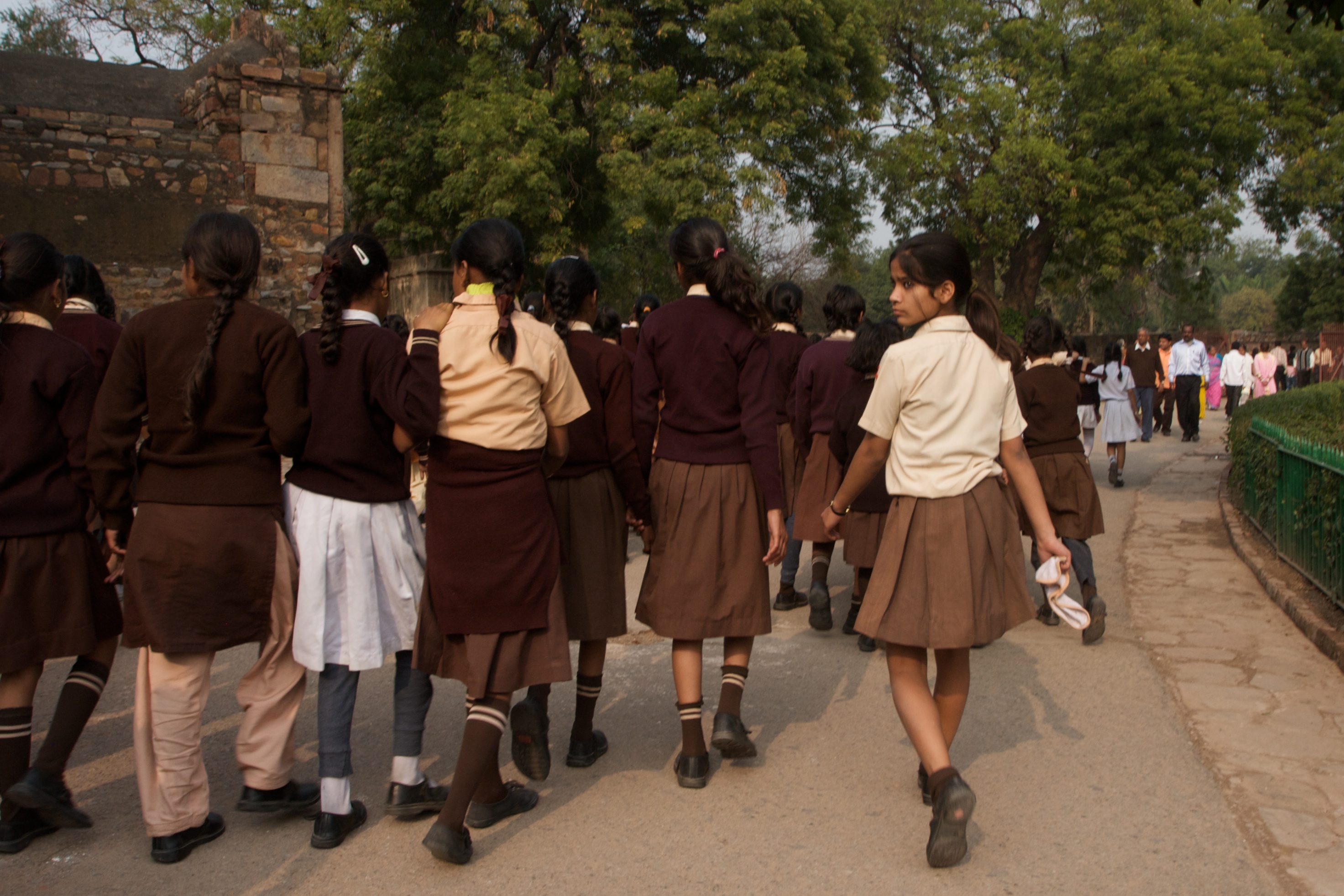 인도에서는 초등학교부터 고등학교까지 교복이 일반적이다. 남학생은 밝은색 셔츠와 어두운색 긴 바지를 입는 경우가 많다. 여학생은 셔츠와 치마를 입는 경우가 많다. 일부 학교에서는 여학생에게 살와르 카미즈를 입도록 하기도 한다. 특히 기독교 계열 미션 스쿨에서는 학생이 넥타이를 착용해야 하는 경우도 있다.[24]인도 정부는 정치적인 결정에 따라 아이들의 종교적 상징 착용을 금지하지 않는다. 일부 이슬람교 여학생은 베일을, 많은 시크교 남학생은 터번을 교복에 맞춰 착용하고 있다. 공립, 사립을 막론하고 많은 학교에서는 남학생의 장발이나 염색을 금지하고 있다.[24]