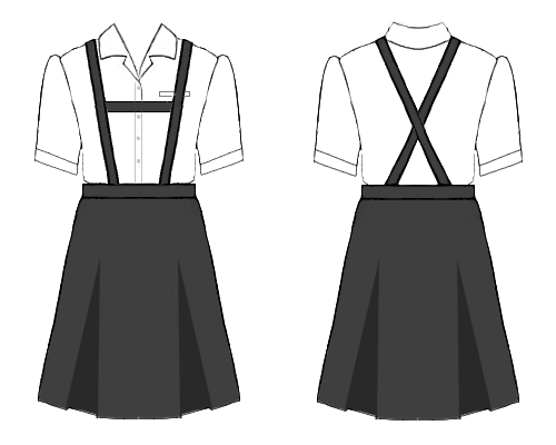 고등학교 여학생 교복 치마는 멜빵치마도 많으며, 남색, 녹색 계열의 체크무늬 등이 보이며, 멜빵 끈의 앞 가슴 부분에 가로 끈이 달린 H형 멜빵 끈 디자인이 많다. 대부분 등 쪽은 십자 형태로 교차되어 있지만, 앞면과 뒷면 모두 같은 H형 멜빵 끈을 사용하는 학교도 있다.[69]