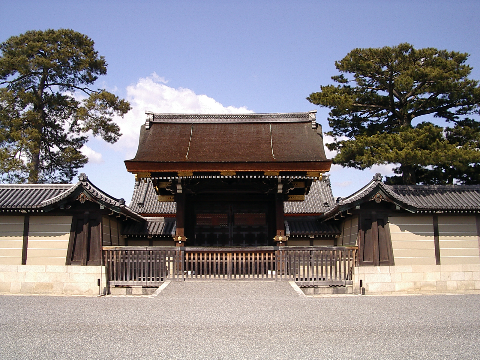 고위 관리들은 편백나무 지붕을 얹고 칠하지 않은 네 개의 나무 기둥으로 지탱되는 건례문을 통해 입장했다. 건례문을 지나면 주홍색으로 칠해지고 기와지붕을 얹은 내문인 ''Jomeimon''이 보이며, Shishin-den으로 이어진다. ''Gekkamon''은 주 마당 서쪽에 있는 작은 문이다.