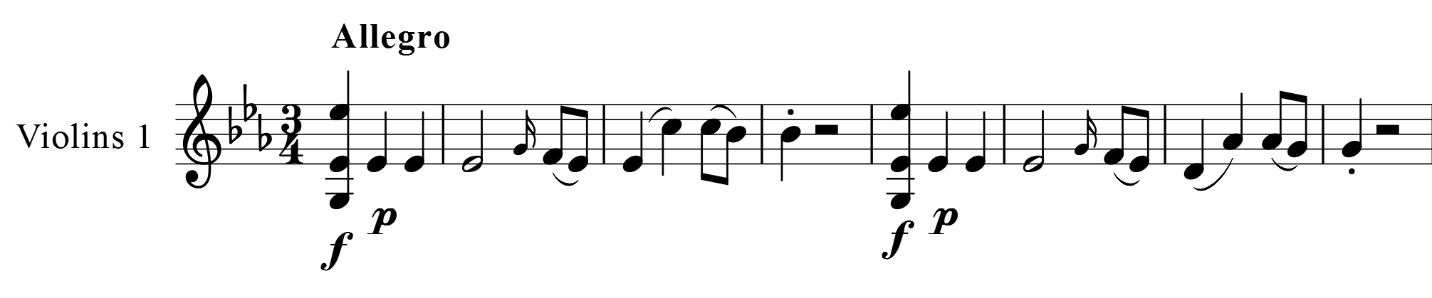 제시부의 각 요소(제1주제, 경과부, 제2주제, 코데타)는 명확한 윤곽이 없고, 발전부에서는 주장이 두 번 강하게 암시된다. 장대한 제1주제는 투티의 강한 연주 후 제1바이올린이 p로 진행한다. 경과부는 하행하는 바이올린 16분음표로 시작, 5도 위 내림나장조에서 저음현 펼침화음 반주 위로 바이올린 제동을 부리는 듯한 하행 동기를 연주하고 관악기가 응답한다. 싱커페이션의 제1바이올린, 다른 현악기 펼침화음 반주 위로 새로운 주제(제2주제)를 연주하고, 제1바이올린이 이것을 계승하는 짧은 코데타가 이어진다.