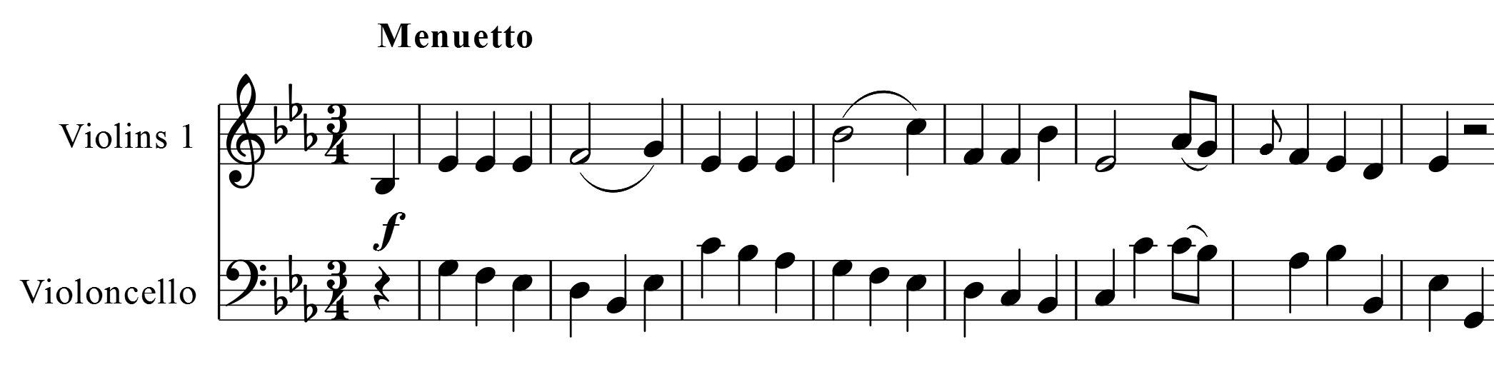 미뉴에트 주부와 트리오는 모두 상당히 단순한 곡이다. H.C. 로빈스 랜드는 "유행가"("Hit tunes")를 선율로 가지고 있다고 언급했다.[10] 대위법 처리가 돋보이는 미뉴에트는 오스트리아 무곡의 건강한 성격을 지닌다. 트리오는 다단조로 시작해 내림나장조로 조성이 불안정해지고, 마지막에 으뜸조를 준비하는 조 구성을 갖는다.
