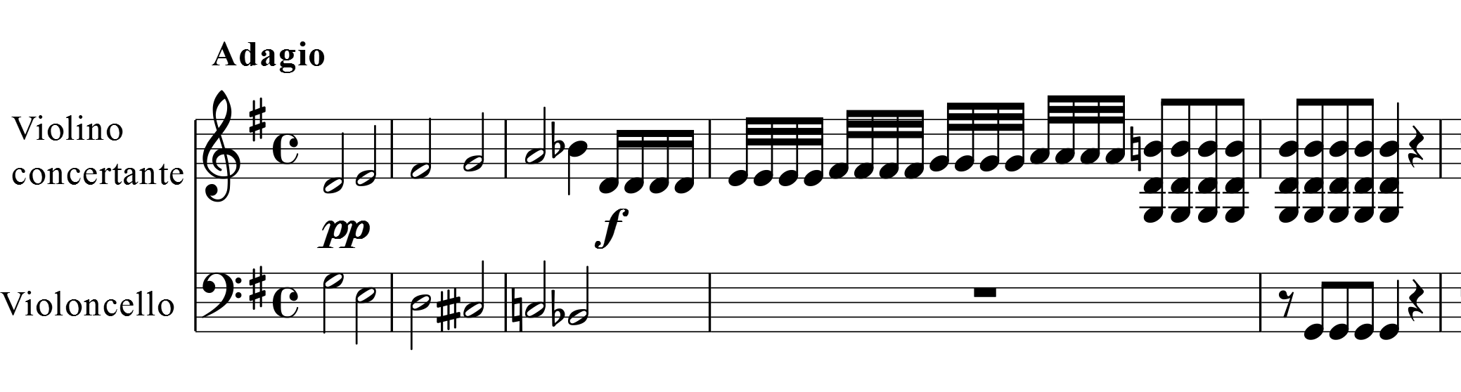 서두의 아다지오는 느리게 상승하는 음계로 시작한다.[6] 화음이 점차 불안정해지면서 독주 바이올린이 등장한다.