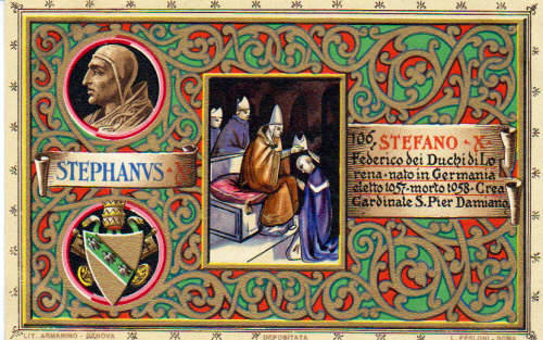 교황 스테파노 9세는 1057년부터 1058년까지 재위한 교황이다. 본명은 프레데리크로, 로렌 공작 고드프루아의 동생이며, 몬테카시노 수도원장이었다. 교황으로 선출되기 전에는 추기경으로 활동하며 교황 레오 9세의 사절로 동서 교회 분열에 관여했다. 재위 기간 동안 성직자 독신주의를 강조하고 교회 개혁을 추진했으며, 남부 이탈리아의 노르만족을 몰아내기 위한 계획을 세웠다. 1058년 피렌체에서 사망했으며, 로마인들의 사주로 독살되었다는 설도 있다.