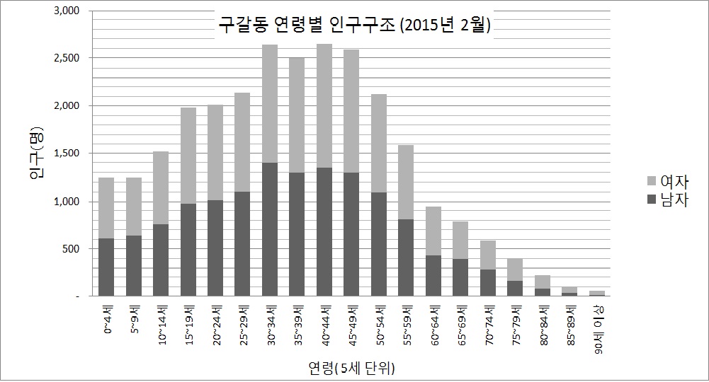 구갈동의 인구구조를 살펴보면 유소년(15세 미만) 인구 비율은 14.70%로 용인시 전체 18.3%보다 적으며, 노년(65세 이상) 인구 비율은 7.90%로 용인시 전체 10.3%보다 적다.[4]