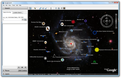 구글 어스는 지구 표면뿐만 아니라 우주 공간과 다른 천체, 해양 등을 탐험할 수 있는 다양한 확장 기능을 제공한다.'''구글 스카이 (Google Sky)'''