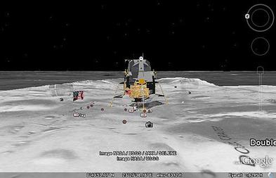 달 표면을 탐험할 수 있는 기능으로, 처음에는 웹 브라우저 애플리케이션으로 제공되다가 아폴로 11호의 달 착륙 40주년인 2009년 7월 20일에 구글 어스에 통합되었다.[39] 구글은 워싱턴 D.C.의 뉴지엄(Newseum)에서 아폴로 11호 승무원이었던 버즈 올드린과 함께 이 기능을 발표하고 시연했다.[40][41] 구글 문은 NASA에서 제공한 자료를 바탕으로 아폴로 계획의 여러 임무들에 대한 가이드 투어, 지도, 비디오, 스트리트 뷰 스타일의 파노라마 이미지 등을 제공한다.