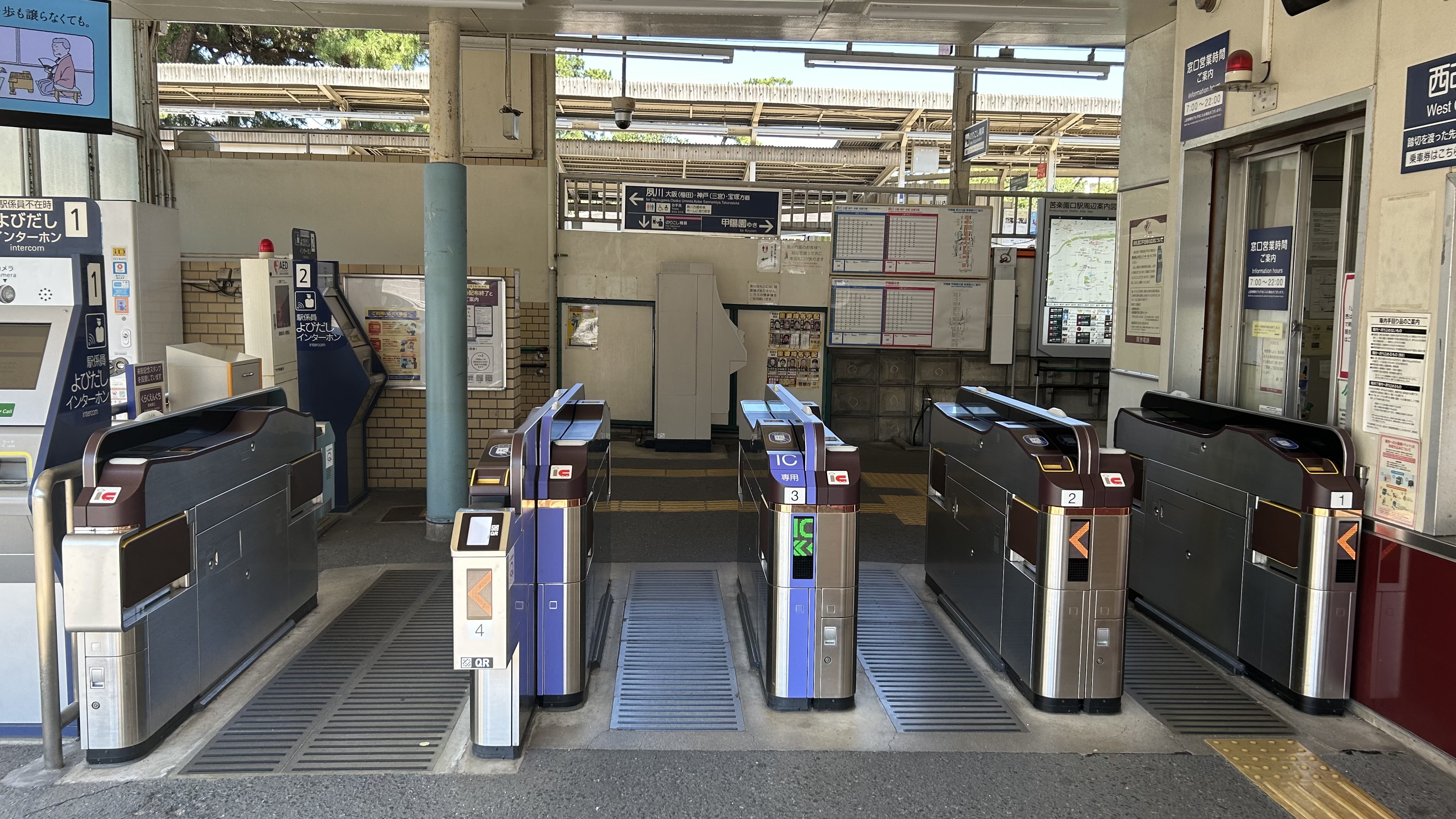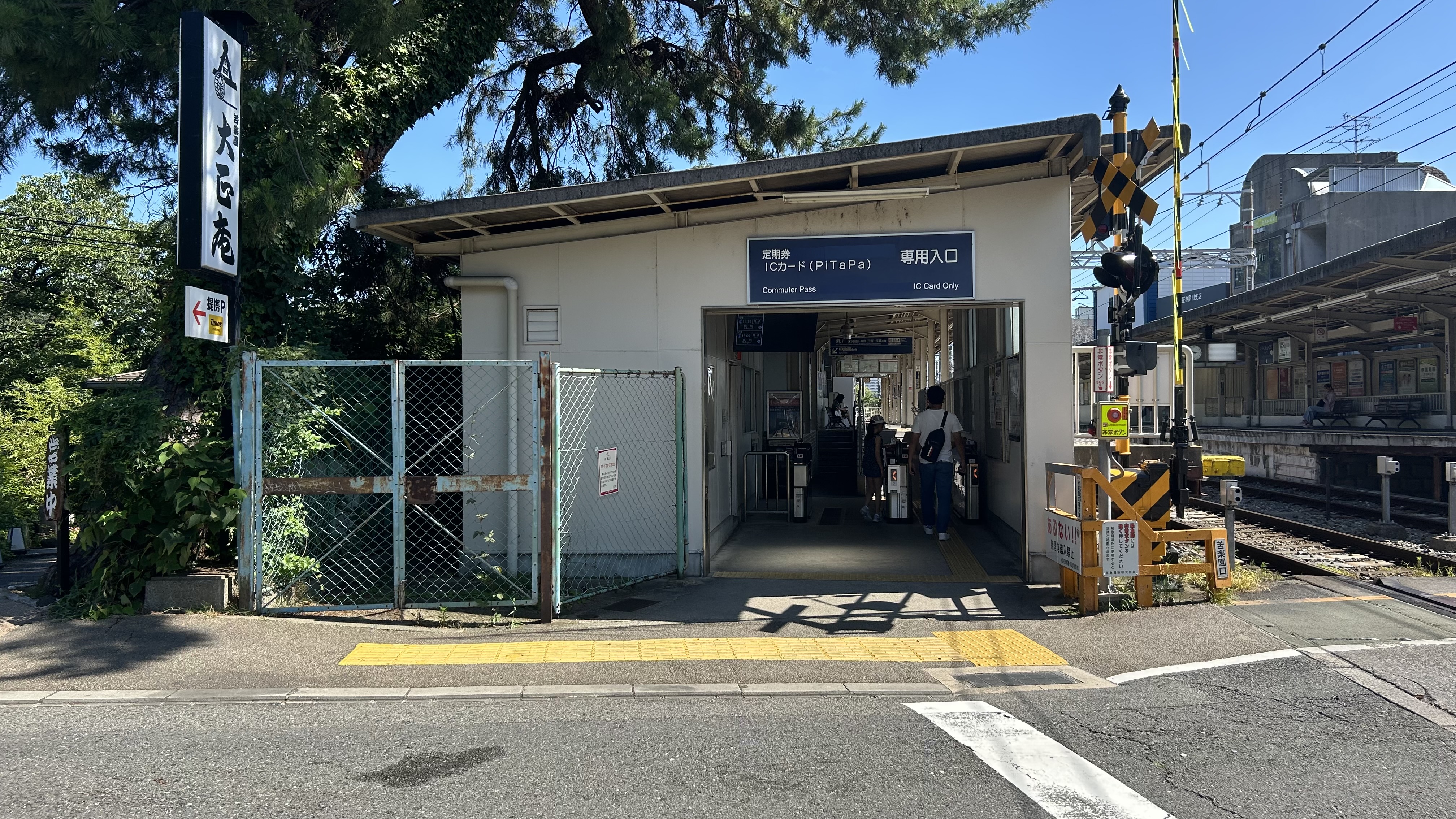 상대식 승강장 2면 2선의 구조에서 교환 설비를 갖춘 지상역이다. 역사(개찰구)는 고요엔 행 승강장의 고요엔 방향에 있는데, 서쪽 출구(서쪽 개찰구)는 유인 개찰구, 자동 개찰기, 자동 발권기가 있고, 슈쿠가와 행 승강장의 고요엔 방향에 있는 동쪽 출구(동쪽 개찰구)는 정기권 카드 전용의 자동 개찰기만 있다.[6] 두 플랫폼은 지하도로 연결된다.[6]화장실은 슈쿠가와 행 승강장 중간에 설치되어 있으며, 다기능 화장실도 병설되어 있다.