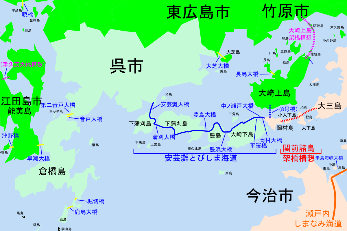 - 섬: 오사키시모지마(大崎下島), 카미카마가리시마(上蒲刈島), 시모카마가리시마(下蒲刈島), 쿠라하시지마(倉橋島), 토요시마(히로시마현), 죠시마(히로시마현)