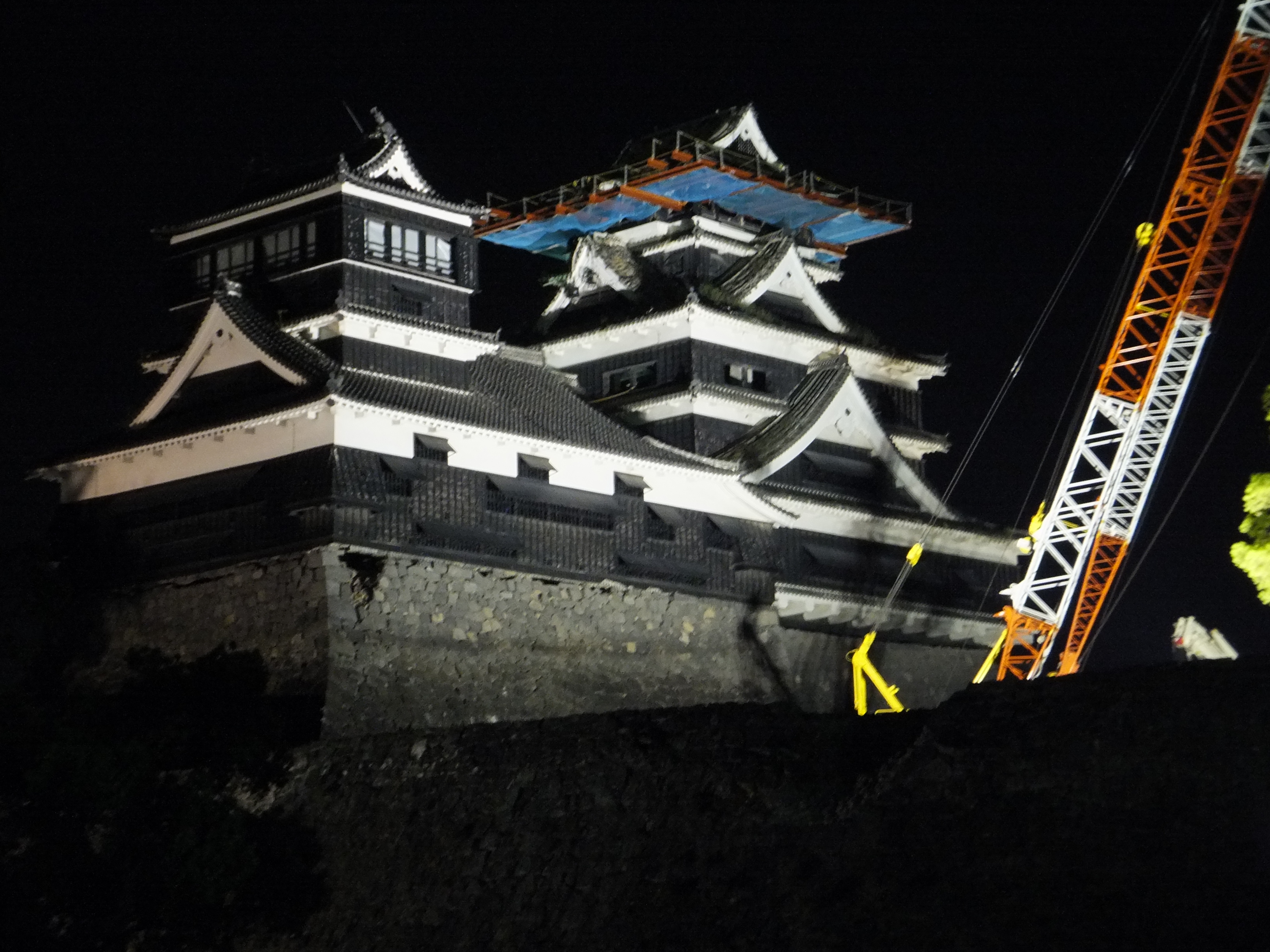 2016년 4월 14일 오후 9시 26분 구마모토 현 마시키 정에서 발생한 규모 6.2의 지진과[24] 다음 날인 4월 15일 규모 7.3의 지진으로 인해 구마모토성은 더욱 큰 피해를 입었다. 천수각 자체는 구조적인 피해가 거의 없었지만,[4] 망루 두 개가 심하게 손상되어 일부가 무너졌고, 천수각 기슭의 외벽이 더 무너졌으며, 천수각 지붕의 많은 기와가 떨어져 나갔다.