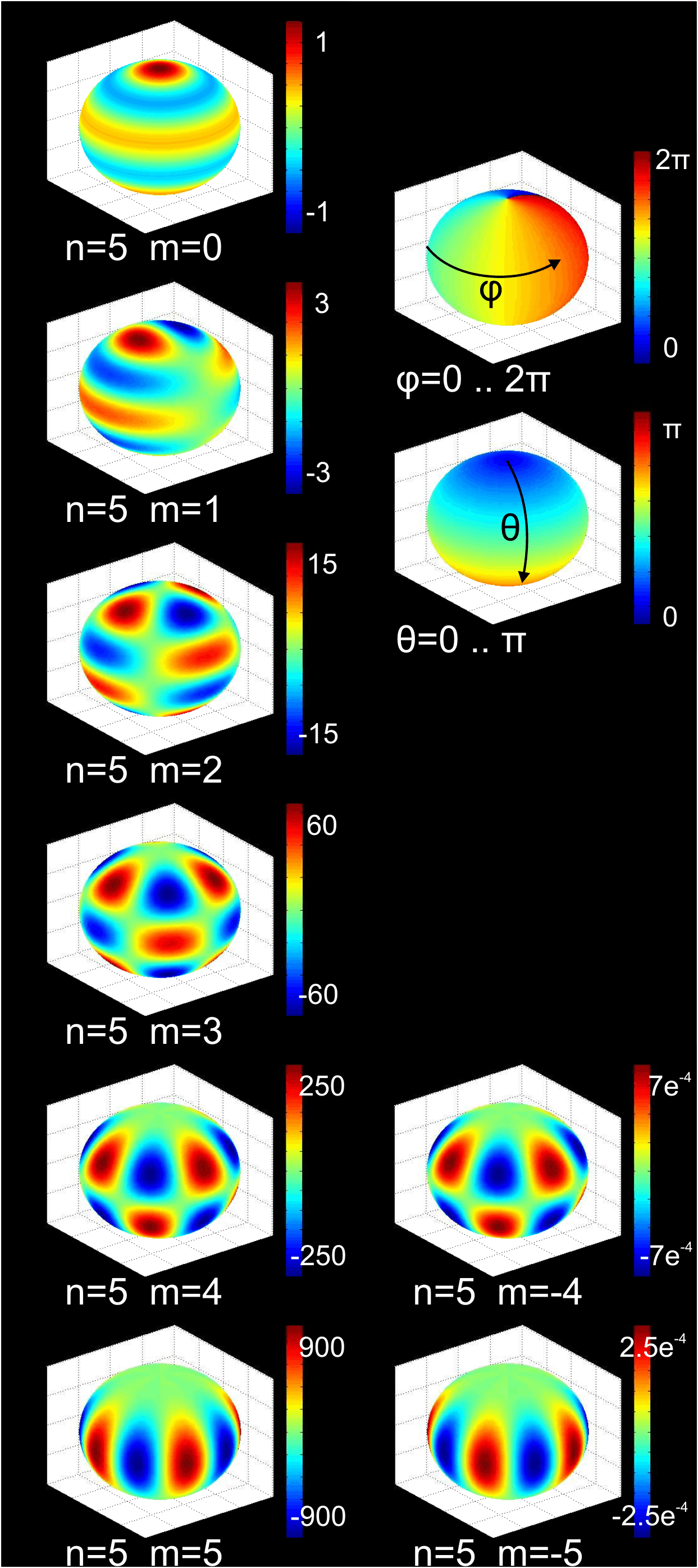 구면 조화 함수의 실수부와 허수부의 몇 가지 처음 몇 가지 모드. 색상은 값의 위상을 나타냄