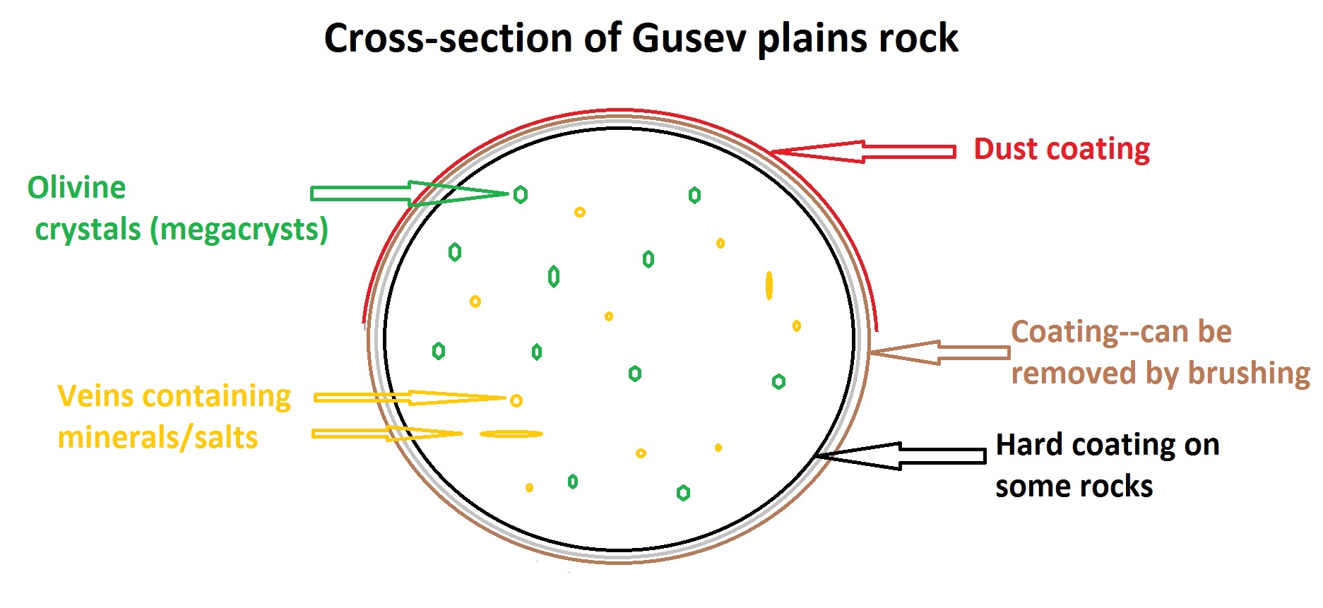 분석 결과, 암석들은 미량의 물에 의해 약간 변형된 것으로 나타났다. 암석 외부 코팅과 내부 균열에서는 물에 의해 퇴적된 광물(아마도 브롬 화합물)이 발견되었다.[49] 모든 암석은 미세한 먼지로 덮여 있었고, 하나 이상의 단단한 껍질을 가지고 있었다. 이 껍질은 암석 마모 도구(RAT)를 사용해 제거할 수 있었다.[49]