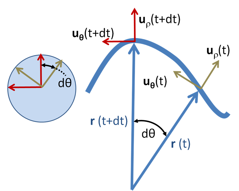 위 결과는 극좌표 를 사용하여 더 간단하게 유도할 수 있으며, 동시에 다음과 같이 평면 내의 일반적인 운동으로 확장할 수 있다. 평면의 극좌표는 방사 단위 벡터 '''u'''ρ 와 각 단위 벡터 '''u'''θ 를 사용한다. [19] 위치 '''r'''에 있는 입자는 다음과 같이 기술된다. :'''r''' = ρ'''u'''ρ 여기서 기호 ''ρ''는 이 거리가 고정되어 있지 않고 시간에 따라 변한다는 것을 강조하기 위해 ''R'' 대신 원점으로부터의 경로 거리를 나타내는 데 사용된다. 단위 벡터 '''u'''ρ 는 입자와 함께 이동하며 항상 '''r'''(''t'')와 같은 방향을 가리킨다. 단위 벡터 '''u'''θ 또한 입자와 함께 이동하며 '''u'''ρ 에 대해 직교한다. 따라서 '''u'''ρ 와 '''u'''θ 는 입자에 부착되고 입자가 이동한 경로에 연결된 국소 직교 좌표계를 형성한다. [20] 단위 벡터의 꼬리를 일치시켜 움직이면 '''u'''ρ 와 '''u'''θ 가 '''r'''(''t'')와 같은 각도 ''θ''(''t'')를 가진 단위원의 둘레를 따라 앞뒤로 추적하는 직각 쌍을 형성하는 것을 알 수 있다.궤적 '''r'''(''t'')를 갖는 입자에 대한 두 시점 ''t''와 ''t'' + ''dt''에서의 극단위 벡터. 왼쪽에는 두 시점에서의 단위 벡터 '''u'''ρ 와 '''u'''θ 의 꼬리가 모두 만나도록 이동되었으며, 단위 반지름 원의 호를 따라 그려짐을 보여준다. 시간 ''dt'' 동안의 회전은 ''d''θ이며, 궤적 '''r'''(''t'')의 회전 각도와 같다. 입자가 움직일 때 속도는 다음과 같다. :'''v''' = (dρ/dt)'''u'''ρ + ρ(d'''u'''ρ /dt) 속도를 평가하려면 단위 벡터 '''u'''ρ 의 도함수가 필요하다. '''u'''ρ 는 단위 벡터이기 때문에 크기는 고정되어 있으며 방향만 변경될 수 있다. 즉, 그 변화 d'''u'''ρ 는 '''u'''ρ 에 수직인 성분만 갖는다. 궤적 '''r'''(''t'')가 d''θ''만큼 회전하면 '''r'''(''t'')와 같은 방향을 가리키는 '''u'''ρ 도 d''θ''만큼 회전한다. 따라서 '''u'''ρ 의 변화는 다음과 같다. :d'''u'''ρ = '''u'''θ dθ 또는 :(d'''u'''ρ /dt) = '''u'''θ (dθ/dt) 마찬가지로 '''u'''θ 의 변화율을 구할 수 있다. '''u'''ρ 와 마찬가지로 '''u'''θ 는 단위 벡터이며 크기를 변경하지 않고 회전만 할 수 있다. 궤적 '''r'''(''t'')가 d''θ''만큼 회전하는 동안 '''u'''ρ 에 대해 직교를 유지하기 위해 '''r'''(''t'')에 직교하는 '''u'''θ 도 d''θ''만큼 회전한다. 따라서 변화 d'''u'''θ 는 '''u'''θ 에 직교하고 d''θ''에 비례한다. :(d'''u'''θ /dt) = -(dθ/dt)'''u'''ρ 위 식은 부호가 음수임을 보여준다. 직교성을 유지하려면, d'''u'''ρ 가 d''θ''에 대해 양수이면 d'''u'''θ 는 감소해야 한다. '''u'''ρ 의 도함수를 속도에 대한 식에 대입하면: :'''v''' = (dρ/dt)'''u'''ρ + ρ'''u'''θ (dθ/dt) = vρ '''u'''ρ + vθ '''u'''θ = '''v'''ρ + '''v'''θ 가속도를 얻으려면 시간 미분을 한 번 더 수행한다. :'''a''' = (d2 ρ/dt2 )'''u'''ρ + (dρ/dt)(d'''u'''ρ /dt) + (dρ/dt)'''u'''θ (dθ/dt) + ρ(d'''u'''θ /dt)(dθ/dt) + ρ'''u'''θ (d2 θ/dt2 ) '''u'''ρ 와 '''u'''θ 의 도함수를 대입하면 입자의 가속도는 다음과 같다. [21] :'''a''' = (d2 ρ/dt2 )'''u'''ρ + 2(dρ/dt)'''u'''θ (dθ/dt) - ρ'''u'''ρ (dθ/dt)2 + ρ'''u'''θ (d2 θ/dt2 ) = '''u'''ρ [(d2 ρ/dt2 ) - ρ(dθ/dt)2 ] + '''u'''θ [2(dρ/dt)(dθ/dt) + ρ(d2 θ/dt2 )] = '''u'''ρ [(dvρ /dt) - (vθ 2 /ρ)] + '''u'''θ [(2/ρ)vρ vθ + ρ(d/dt)(vθ /ρ)] 특정한 예로, 입자가 일정한 반지름 ''R''의 원형으로 움직이는 경우 d''ρ''/d''t'' = 0, '''v''' = '''v'''θ 이고: :'''a''' = '''u'''ρ [-ρ(dθ/dt)2 ] + '''u'''θ [ρ(d2 θ/dt2 )] = '''u'''ρ [-(v2 /r)] + '''u'''θ [(dv/dt)] 여기서 v = vθ . 이 결과는 등속원운동이 아닌 경우에 대한 위 결과와 일치한다. 등속원운동이 아닌 경우에 대한 문서도 참조하라. 이 가속도에 입자 질량을 곱하면, 첫 번째 항은 구심력이고, 각가속도와 관련된 두 번째 항의 음수는 때때로 오일러 힘 이라고 불린다. [22] 원운동 이외의 궤적, 예를 들어 더 일반적인 궤적의 경우, 궤적의 순간 회전 중심과 곡률 반지름은 '''uρ '''와 '''uθ '''로 정의된 좌표계와 길이 |'''r'''(''t'')| = ''ρ''와 간접적으로만 관련된다. 따라서 일반적인 경우에는 위의 일반적인 가속도 방정식에서 구심력과 오일러 항을 분리하기가 간단하지 않다. [23] [24]곡선 상의 평면 운동에 대한 국소 좌표계. 곡선을 따라 거리 ''s''와 ''s'' + ''ds''에 대해 두 개의 서로 다른 위치가 표시되어 있습니다. 각 위치 ''s''에서 단위 벡터 '''u'''n 은 곡선의 바깥쪽 법선을 따라 향하고 단위 벡터 '''u'''t 는 경로에 접선입니다. 경로의 곡률 반지름은 호 길이에 대한 접선의 회전율로 구해지는 ρ이며 위치 ''s''에서 접촉원의 반지름입니다. 왼쪽의 단위원은 ''s''에 대한 단위 벡터의 회전을 보여줍니다. 국소 좌표계는 입자와 함께 이동하고, [25] 입자의 경로에 의해 방향이 결정되는 좌표계를 의미한다. [26] 오른쪽 그림과 같이 경로에 접선 및 법선인 단위 벡터가 형성된다. 이 좌표계는 때때로 ''내재적'' 또는 ''경로 좌표'' [27] [28] 또는 이러한 단위 벡터를 가리키는 ''nt 좌표''라고도 한다. 이러한 좌표는 미분 형식 이론의 보다 일반적인 국소 좌표 개념의 매우 특수한 예이다. [29] 입자의 경로를 따라 거리는 호 길이 ''s''이며, 시간의 알려진 함수로 간주된다. : s = s(t) \ . 곡률 중심은 각 위치 ''s''에 법선 '''u'''n (''s'')을 따라 선상에서 곡선으로부터 거리 ''ρ''(곡률 반지름)에 위치하도록 정의된다. 