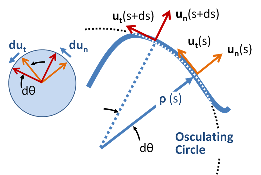 국소 좌표계는 입자와 함께 이동하고, [25] 입자의 경로에 의해 방향이 결정되는 좌표계를 의미한다. [26] 오른쪽 그림과 같이 경로에 접선 및 법선인 단위 벡터가 형성된다. 이 좌표계는 때때로 ''내재적'' 또는 ''경로 좌표'' [27] [28] 또는 이러한 단위 벡터를 가리키는 ''nt 좌표''라고도 한다. 이러한 좌표는 미분 형식 이론의 보다 일반적인 국소 좌표 개념의 매우 특수한 예이다. [29] 입자의 경로를 따라 거리는 호 길이 ''s''이며, 시간의 알려진 함수로 간주된다. : s = s(t) \ . 곡률 중심은 각 위치 ''s''에 법선 '''u'''n (''s'')을 따라 선상에서 곡선으로부터 거리 ''ρ''(곡률 반지름)에 위치하도록 정의된다. 호 길이 ''s''에서 필요한 거리 ''ρ''(''s'')는 곡선의 접선 회전율로 정의되며, 이는 경로 자체에 의해 결정된다. 어떤 시작 위치에 대한 접선의 방향이 ''θ''(''s'')라면, ''ρ''(''s'')는 도함수 d''θ''/d''s''로 정의된다. : \frac{1} {\rho (s)} = \kappa (s) = \frac {\mathrm{d}\theta}{\mathrm{d}s}\ . 곡률 반지름은 일반적으로 양수(즉, 절대값)로 취하는 반면, ''곡률'' ''κ''는 부호가 있는 양이다. 곡률 중심과 곡률 반지름을 찾는 기하학적 방법은 접촉원으로 이어지는 극한 과정을 사용한다. [30] [31] 위 그림을 참조하라. 이러한 좌표를 사용하면 경로를 따라 이동이 중심이 끊임없이 변하는 원형 경로의 연속으로 간주되며, 각 위치 ''s''는 반지름 ''ρ''를 갖는 해당 위치에서 비균일 원운동을 구성한다. 그러면 국소 각속도는 다음과 같이 주어진다. : \omega(s) = \frac{\mathrm{d}\theta}{\mathrm{d}t} = \frac{\mathrm{d}\theta}{\mathrm{d}s} \frac {\mathrm{d}s}{\mathrm{d}t} = \frac{1}{\rho(s)}\ \frac {\mathrm{d}s}{\mathrm{d}t} = \frac{v(s)}{\rho(s)}\ , 국소 속도 ''v''는 다음과 같이 주어진다. : v(s) = \frac {\mathrm{d}s}{\mathrm{d}t}\ . 위의 다른 예와 마찬가지로 단위 벡터는 크기가 변할 수 없기 때문에 그 변화율은 항상 방향에 수직이다(위 그림의 왼쪽 삽입 그림 참조): [32] : \frac{d\mathbf{u}_\mathrm{n}(s)}{ds} = \mathbf{u}_\mathrm{t}(s)\frac{d\theta}{ds} = \mathbf{u}_\mathrm{t}(s)\frac{1}{\rho} \ ; \frac{d\mathbf{u}_\mathrm{t}(s)}{\mathrm{d}s} = -\mathbf{u}_\mathrm{n}(s)\frac{\mathrm{d}\theta}{\mathrm{d}s} = - \mathbf{u}_\mathrm{n}(s)\frac{1}{\rho} \ . 결과적으로 속도와 가속도는 다음과 같다. [1] [33] [34] : \mathbf{v}(t) = v \mathbf{u}_\mathrm{t}(s)\ ; 그리고 미분의 연쇄 법칙을 사용하여: : \mathbf{a}(t) = \frac{\mathrm{d}v}{\mathrm{d}t} \mathbf{u}_\mathrm{t}(s) - \frac{v^2}{\rho}\mathbf{u}_\mathrm{n}(s) \ ; 접선 가속도 \frac{\mathrm{\mathrm{d}}v}{\mathrm{\mathrm{d}}t} = \frac{\mathrm{d}v}{\mathrm{d}s}\ \frac{\mathrm{d}s}{\mathrm{d}t} = \frac{\mathrm{d}v}{\mathrm{d}s}\ v \ . 이 국소 좌표계에서 가속도는 국소 반지름 ''ρ''(''s'')를 갖는 비균일 원운동에 대한 표현과 유사하며, 구심 가속도는 두 번째 항으로 식별된다. [35] 이 방법을 3차원 공간 곡선으로 확장하면 프레네-세르레 공식이 생성된다. [36] [37]