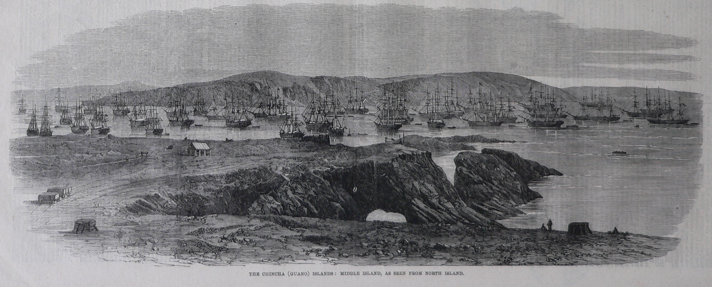 훔볼트는 19세기 초 남아메리카를 탐험하면서 현지인들이 구아노를 비료로 사용하여 농작물 생산량을 늘리는 것을 발견했다. 1804년 유럽으로 돌아온 훔볼트는 페루의 구아노를 수입하여 비료로 사용하면 농작물 생산량을 크게 늘릴 수 있다고 알렸으나, 당시에는 큰 관심을 받지 못했다.[61]1841년, '농예화학의 아버지'로 불리는 리비히가 '식물의 무기 영양론'을 발표하면서 상황이 바뀌었다. 리비히는 식물이 공기 중 이산화탄소와 뿌리에서 얻는 질소 화합물, 미네랄을 통해 성장하며, 비료의 가장 중요한 성분이 질소임을 밝혔다. 일반 퇴비보다 구아노에 질소와 인 함량이 훨씬 높았던 이유는 건조한 해안 지방에서 바닷새 배설물이 오랜 세월 쌓이면서 질소가 농축되었기 때문이다.[62] 리비히의 발표 이후 유럽인들은 구아노를 수입하기 시작했다.[63][64] 구아노에 다량 함유된 질소는 화약 제조에도 유용하여 경제적 가치가 상승했고, 구아노를 수출한 페루 경제는 크게 호황을 누렸다.