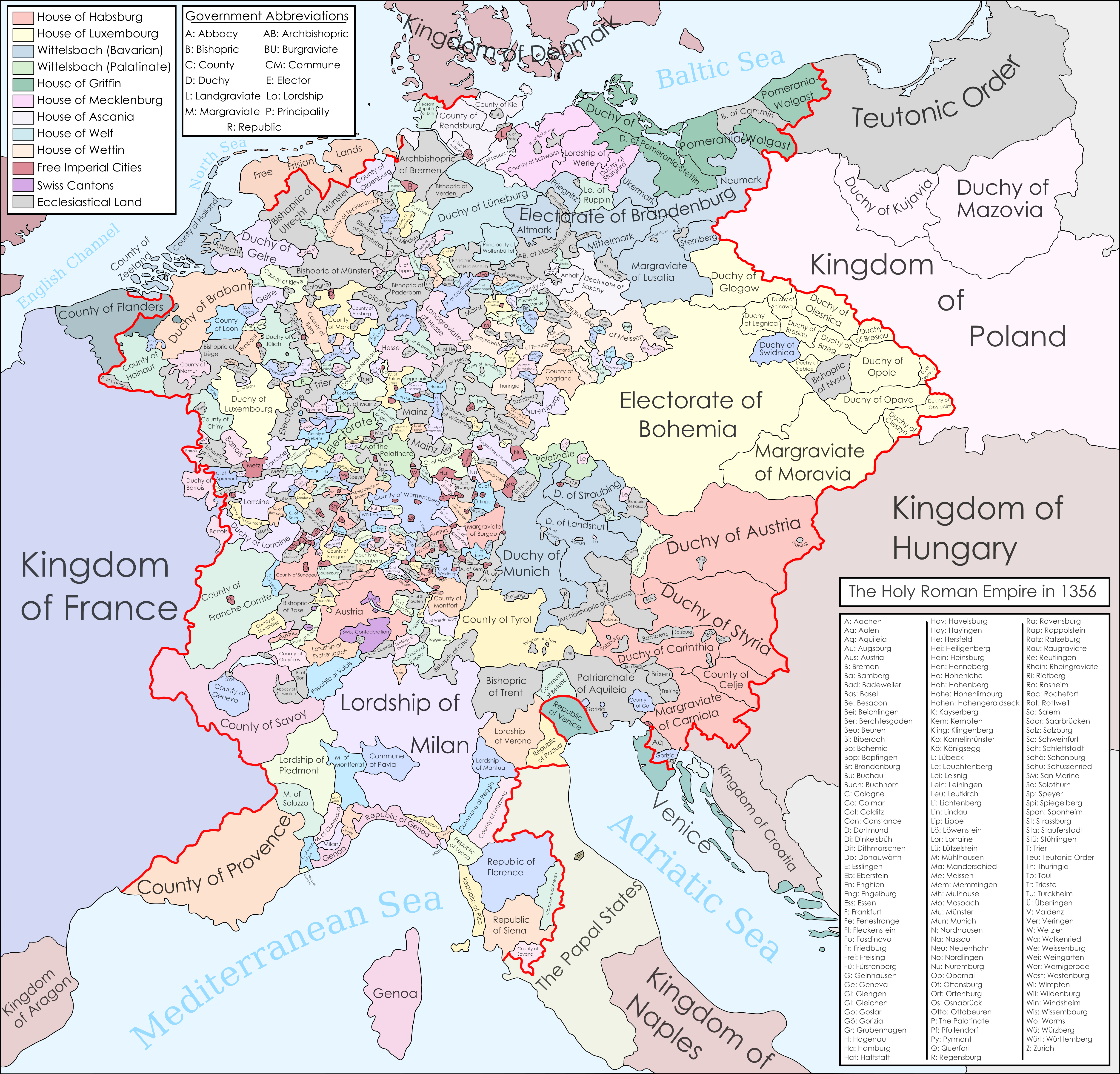 아레초, 크레모나, 포를리, 모데나, 오시모, 피사, 피스토이아, 시에나, 스폴레토, 토디, 키에티, 루카 | 볼로냐, 브레시아, 크레마, 제노바, 로디, 만토바, 오르비에토, 알레산드리아, 페루자, 페라라, 피렌체, 안코나 | 베르가모, 밀라노, 아스티, 파도바, 파르마, 피아첸차, 트레비소, 베로나, 비첸차 |