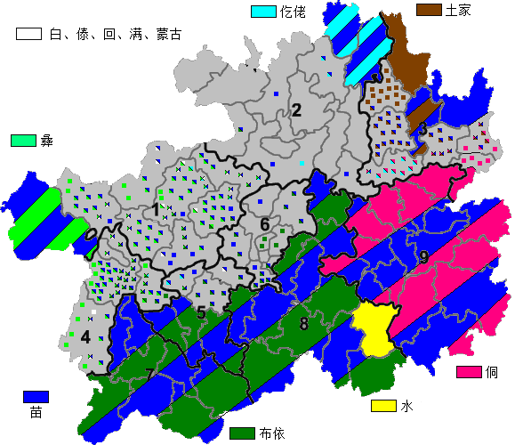 민족 구성 | 한족 - 62% 먀오족 - 12% 부이족 - 8% 둥족 - 5% 투자족 - 4% 이족 - 2% 미확인 민족 - 2% 거라오족 - 2% 수이족 - 1% |