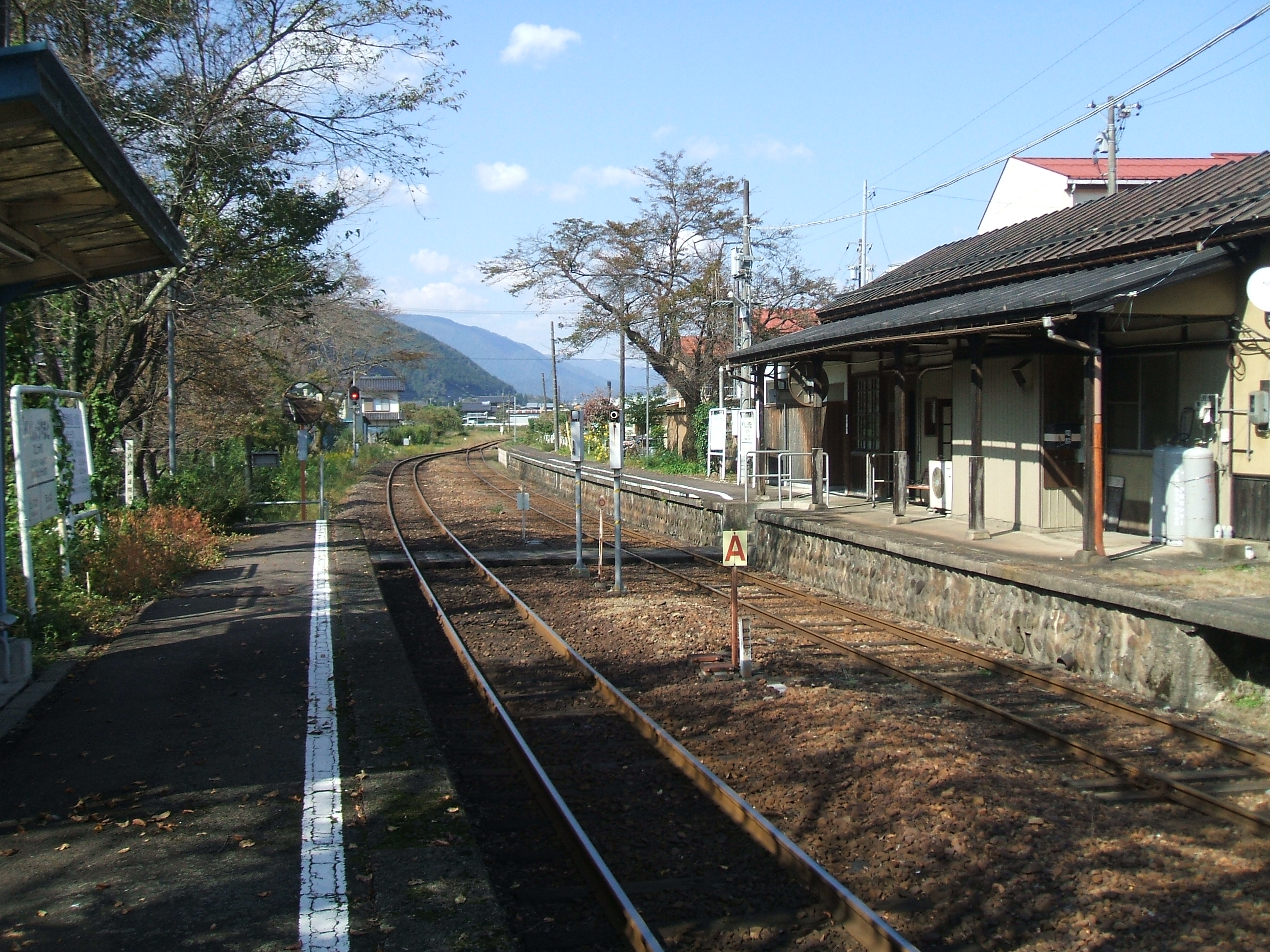 무인역으로, 역사에는 찻집 "찻집 나가라"가 있지만, 승차권 발매 등의 역무는 수행하지 않는다.[3] 승강장은 서로 교차하여 배치되어 있으며, 역사 측 승강장 중앙에서 구내 건널목은 맞은편 승강장 끝에 연결된다.[3]