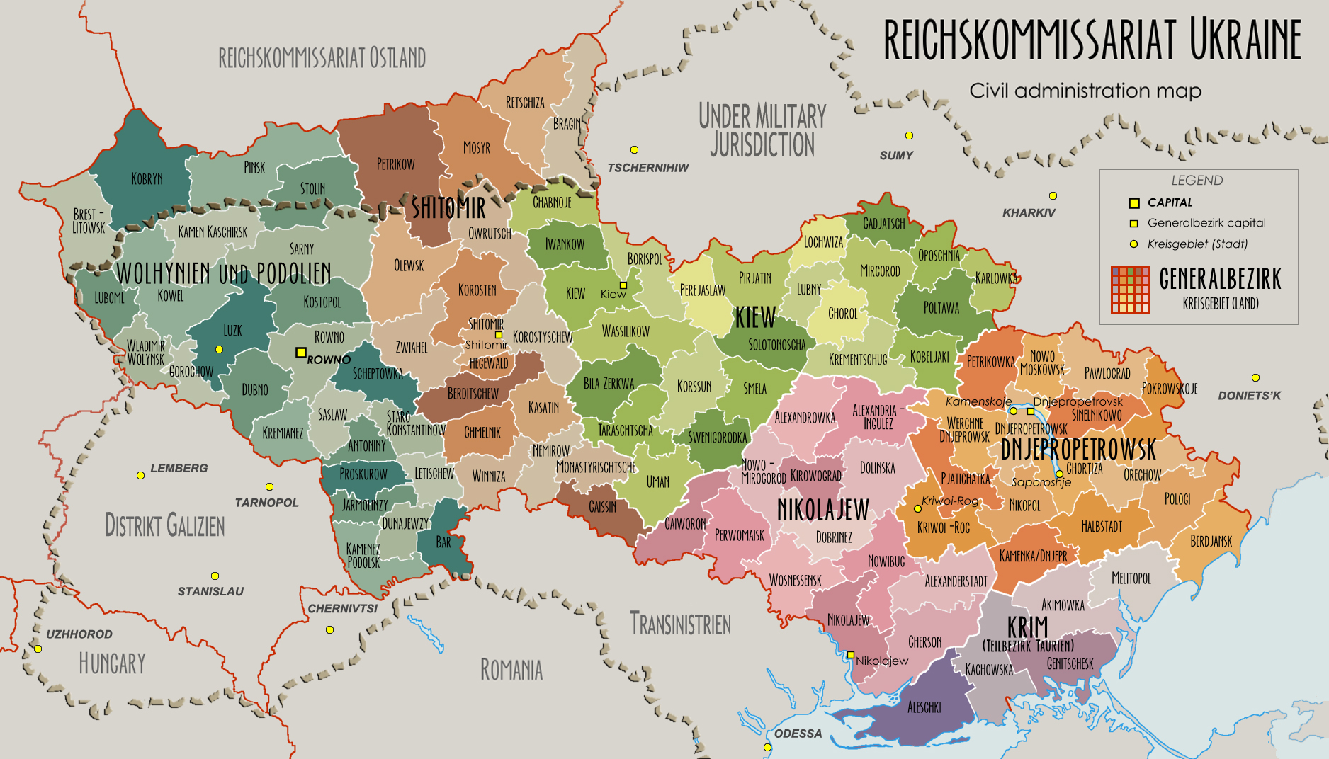 우크라이나 국가판무관부 (RKU) | 갈리치아 동부, 루마니아의 트란스니스트리아, 크림반도를 제외한 우크라이나, 1941년 5월 말 볼가강 지역 편입 | 1941년~1944년 | |