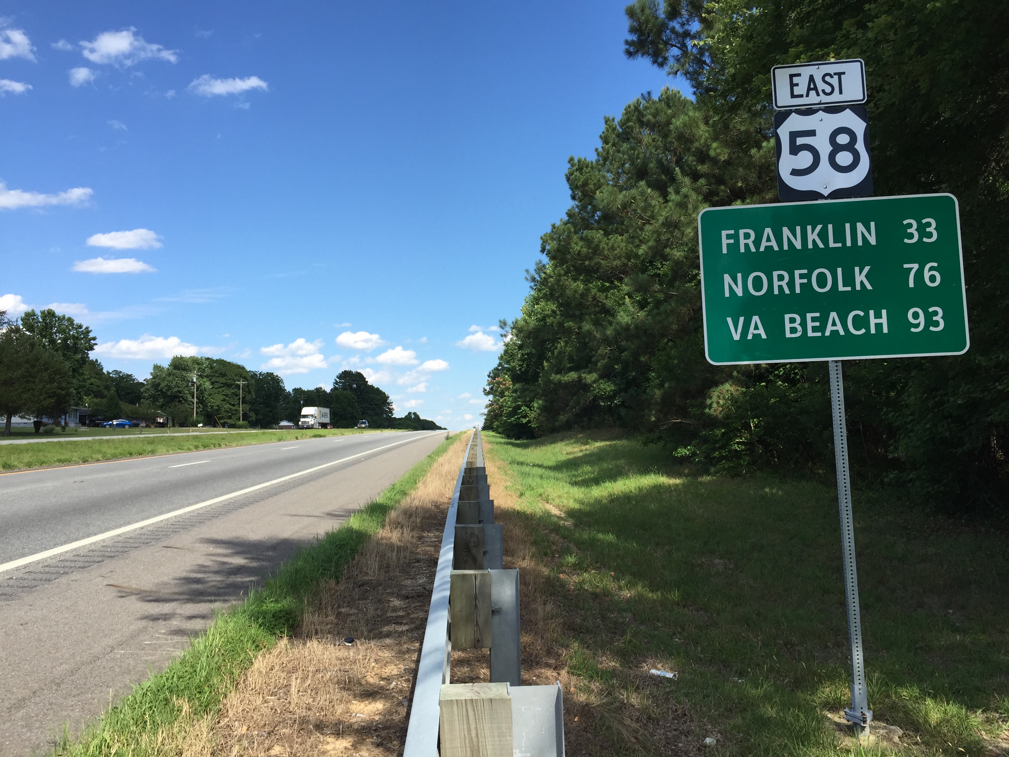 US 58은 사우스 힐에서 US 1번 국도와 주간 고속도로 85호선을, 임포리아에서 주간 고속도로 95호선을 교차한다. 프랭클린 근처에서 US 58은 도시 남쪽 우회로를 이용하며, 서퍽 주변에서는 US 13, US 460과 동시 노선을 시작한다.