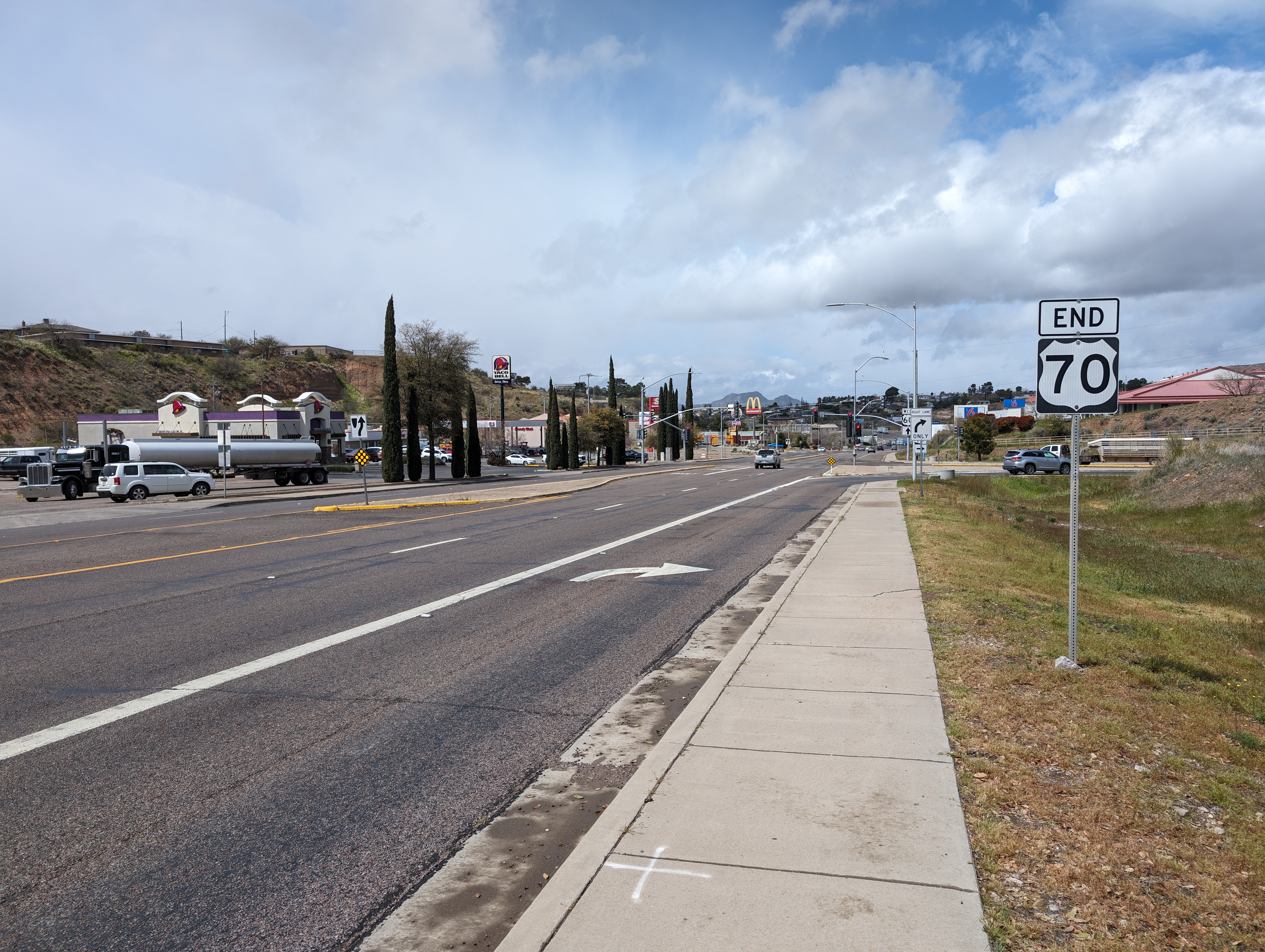 70번 국도는 글로브에서 60번 국도와 만나는 지점에서 시작하며, 77번 주도와 겹친다.[4] 77번 주도는 도시 동쪽에서 갈라진다. 70번 국도는 그 후 샌 카를로스 아파치 인디언 보호구역으로 들어가 남동쪽으로 약 27.36km 달려 페리도트에 도착하며, 이곳에서 인디언 루트 9를 통과한다. 그 후 새퍼드까지 다른 고속도로와 교차하지 않으며, 새퍼드에서 191번 국도와 약 16.09km 구간을 겹쳐서 지나간다. 그 후 70번 국도는 약 59.55km[4] 더 지나 프랭클린 동쪽에서 뉴멕시코주로 진입한다.